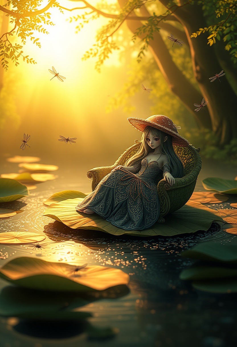 A melancholic, fairy-like mushroom creature with long, flowing hair and a beautifully intricate gown sits on a large, delicate lily pad. She rests on a sofa made of intricately woven leaves, gazing wistfully into the distance. Time seems to slow around her, as the golden sunlight filters through the trees and reflects off the sparkling lake water. Dragonflies and small insects lazily circle around her, creating a serene yet melancholic atmosphere. The scene is bathed in warm, gentle light, as the tranquil lake shimmers under the soft afternoon sun, emphasizing her pensive mood.