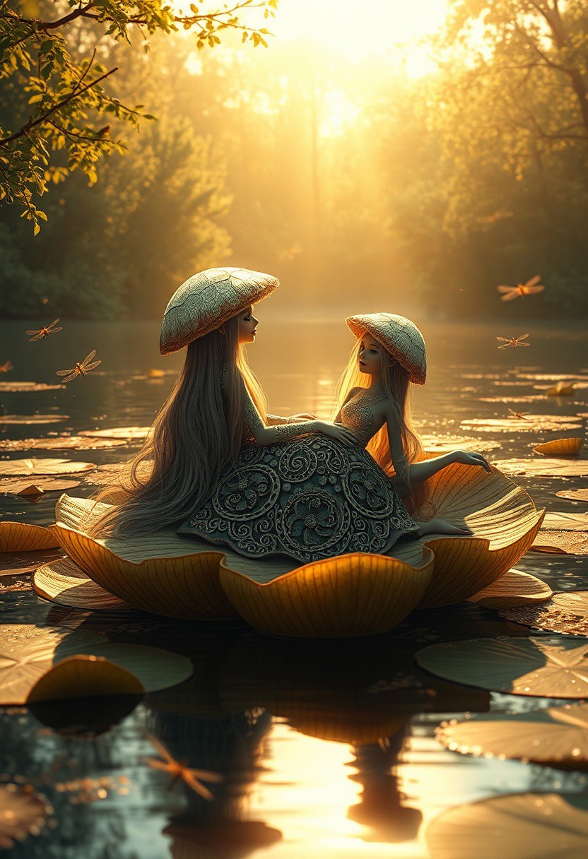 A melancholic, fairy-like mushroom creature with long, flowing hair and a beautifully intricate gown sits on a large, delicate lily pad. She rests on a sofa made of intricately woven leaves, gazing wistfully into the distance. Time seems to slow around her, as the golden sunlight filters through the trees and reflects off the sparkling lake water. Dragonflies and small insects lazily circle around her, creating a serene yet melancholic atmosphere. The scene is bathed in warm, gentle light, as the tranquil lake shimmers under the soft afternoon sun, emphasizing her pensive mood.