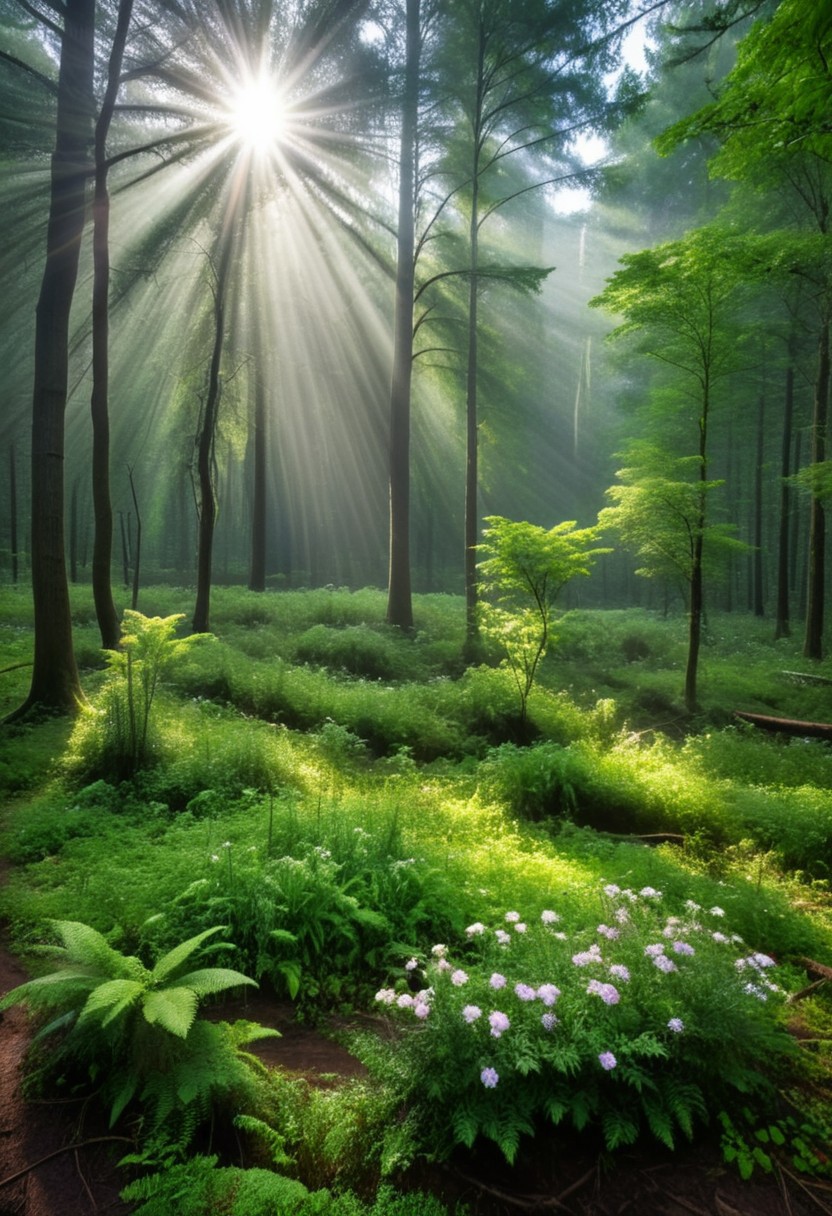 sunlight, nature, outdoors, scenery, flowers, rain, delicate forest grove, wild nature, picturesque scenery, enchanting sunrays, beautiful sky, majestic landscape, pristine vegetation, high quality, sharp focus. ultra detailed, vivid colors,