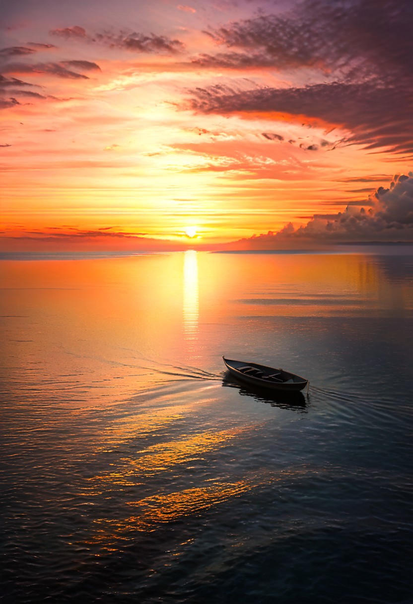 serene seascape during sunset, soft golden light reflecting on gentle waves, vibrant orange to pastel pink sky, delicate clouds, faint silhouettes of island or small boat, peaceful atmosphere, heavenly glow illuminating the horizon, hyperrealistic, cinematic lighting, masterpiece digital painting by Claude Monet and Thomas Kinkade, 8k resolution