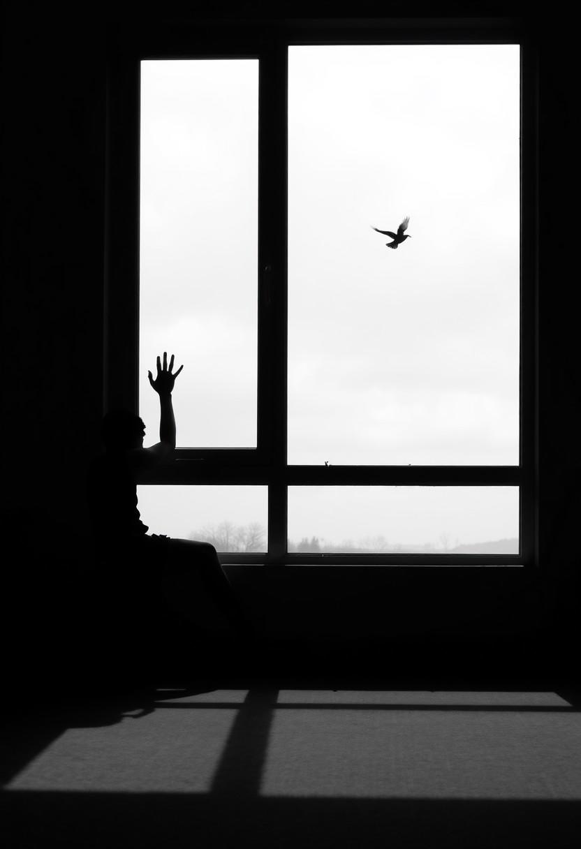 A lone figure is sitting by a window in an empty house, with their hand resting on the glass. Outside, a single bird flies across the overcast sky, and the figure's shadow casts a long silhouette on the floor.