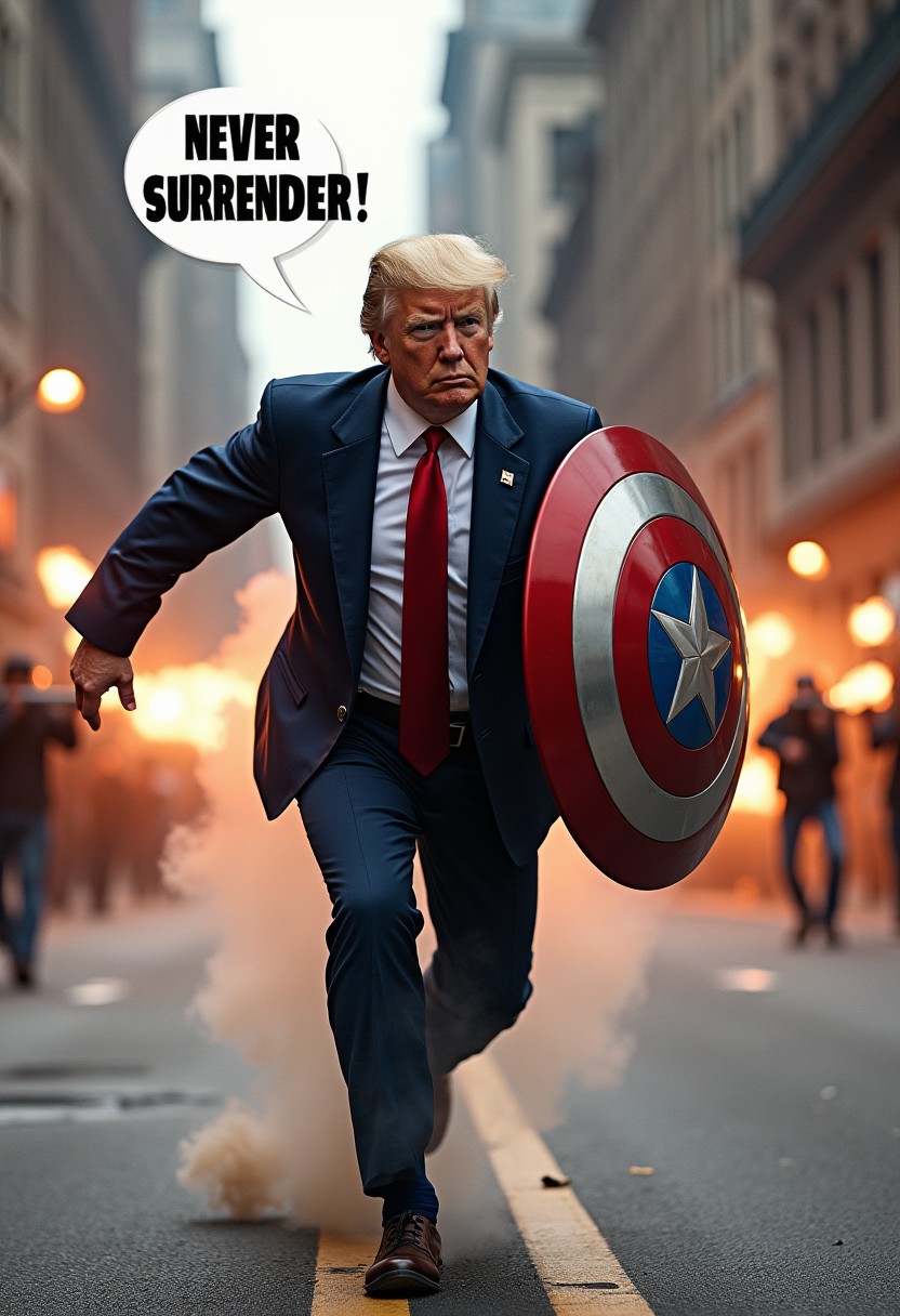 Donald Trump, dressed as Captain America, is running down a city street, shield raised in defense, under heavy gunfire. Bullets zip past his head, trailing smoke, as he dodges and weaves through the chaos, narrowly avoiding the incoming shots. His shield reflects the light of the city as it deflects bullets with metallic clangs. People are firing at him from all directions, but he charges forward with determination. Above him, a text bubble reads, "NEVER SURRENDER!" as he barrels ahead, ready to save America despite the onslaught.