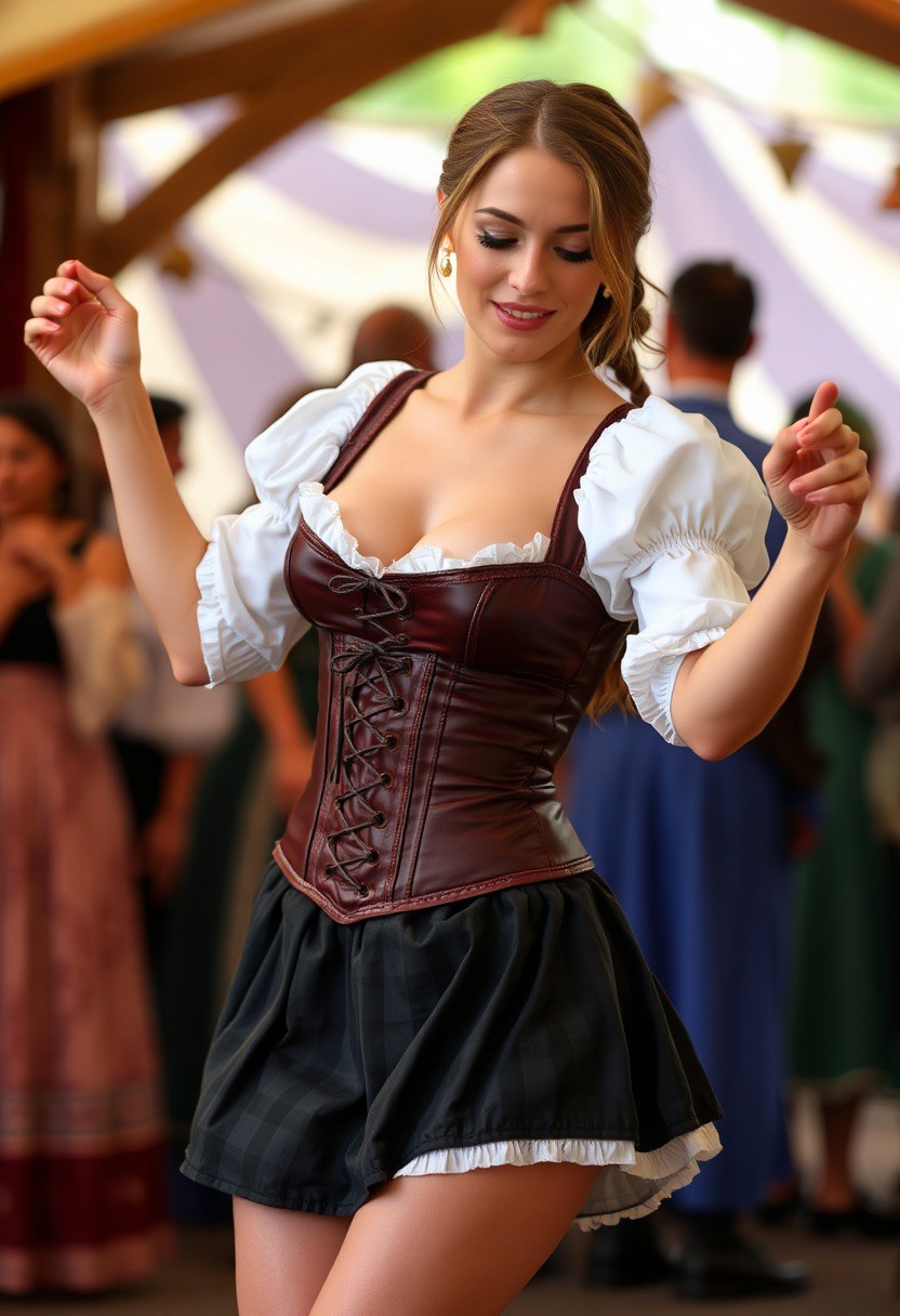 A beautiful woman dancing at a renaissance fair wearing a very short skirt, corset, deep cleavage,