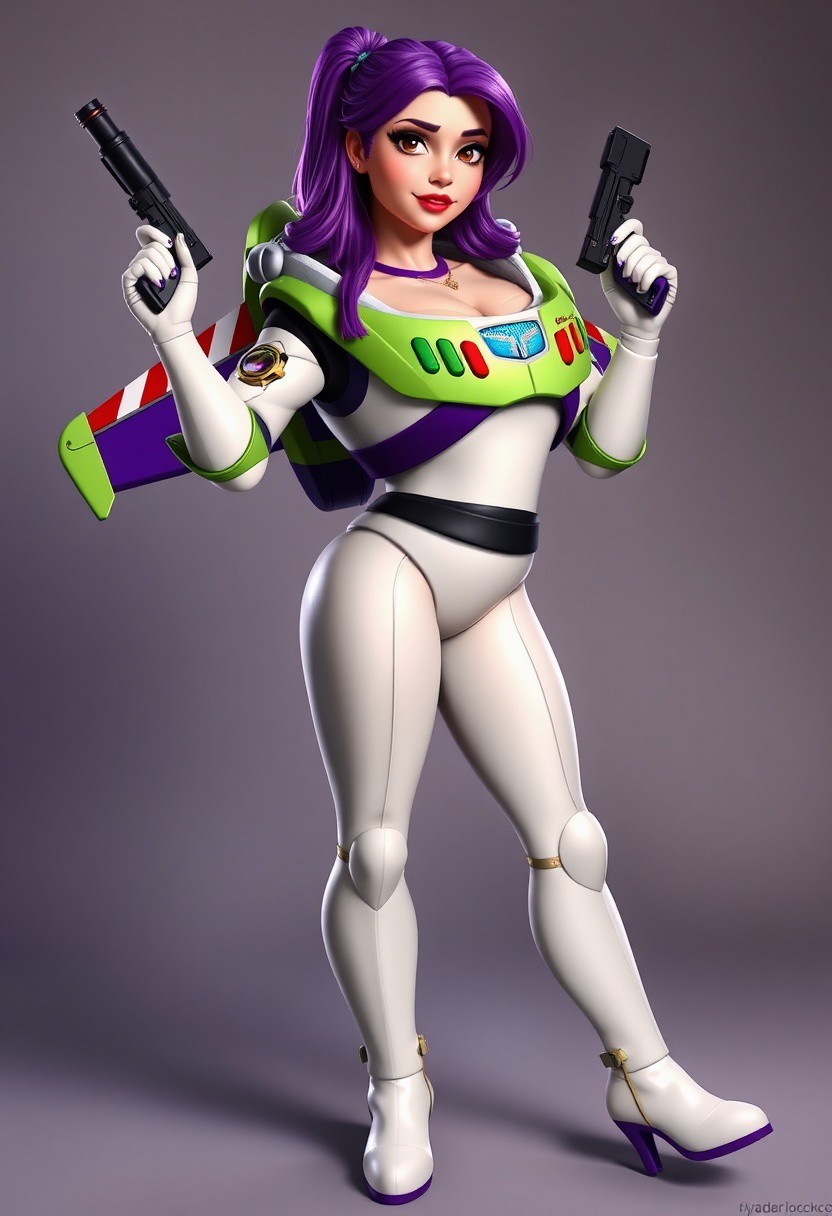 buzz lightyear as a woman with brown eyes, purple long hair, big breast, cleavage, small waist, big butt, white stocking, white space boots, standing with a laser gun in her hand.