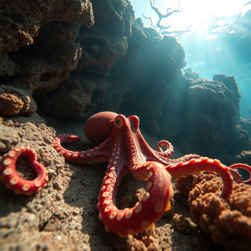 a very detailed close picture of a n octopus underwater near an intricate rock formation, sunlight pasing throw water