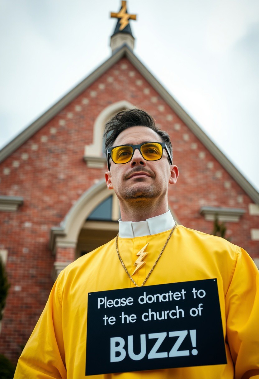 Man wearing yellow tinted glasses and a yellow priest uniform in front of church like building which has a gold lightning bolt symbol on its spire roof, he is wearing golden lightning bolt symbol necklace prominently visible, he is holding sign with text "Please donate to the church of BUZZ!"
