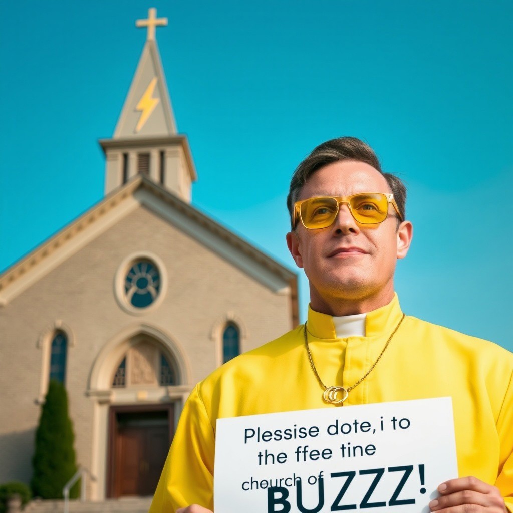 Man wearing yellow tinted glasses and a yellow priest uniform in front of church like building which has a gold lightning bolt symbol on its spire roof, he is wearing golden lightning bolt symbol necklace prominently visible, he is holding sign with text "Please donate to the church of BUZZ!"