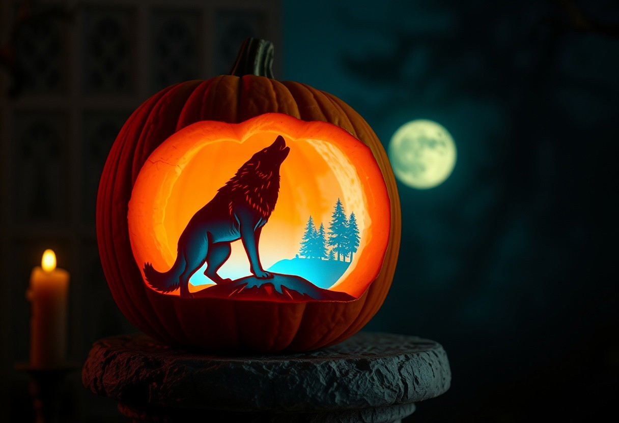 A masterful cinematic photography shot of a beautifully, detailed carved pumpkin, glowing from within on top of an old stone pedestal. The relief like carving on the pumpkin uses different cutting layers into the pumpkin and inlays of gold and cyan to create a beautiful scene that glows from within with bright candle light. The scene carved into the pumpkin is a wolf howling at the full moon. The composition focuses on the pumpkin and the carving, the stone pedestal and the dark, spooky surrounding are only accompanying, out of focus. The colour pallet uses three colours dominantly rich orange tones, deep bright cyan and bright gold. The overall setting is mysterious, dark and spooky. The light setup masterfully catches the glow from within the pumpkin and enough light from outside to display the detailed carving on the pumpkin.