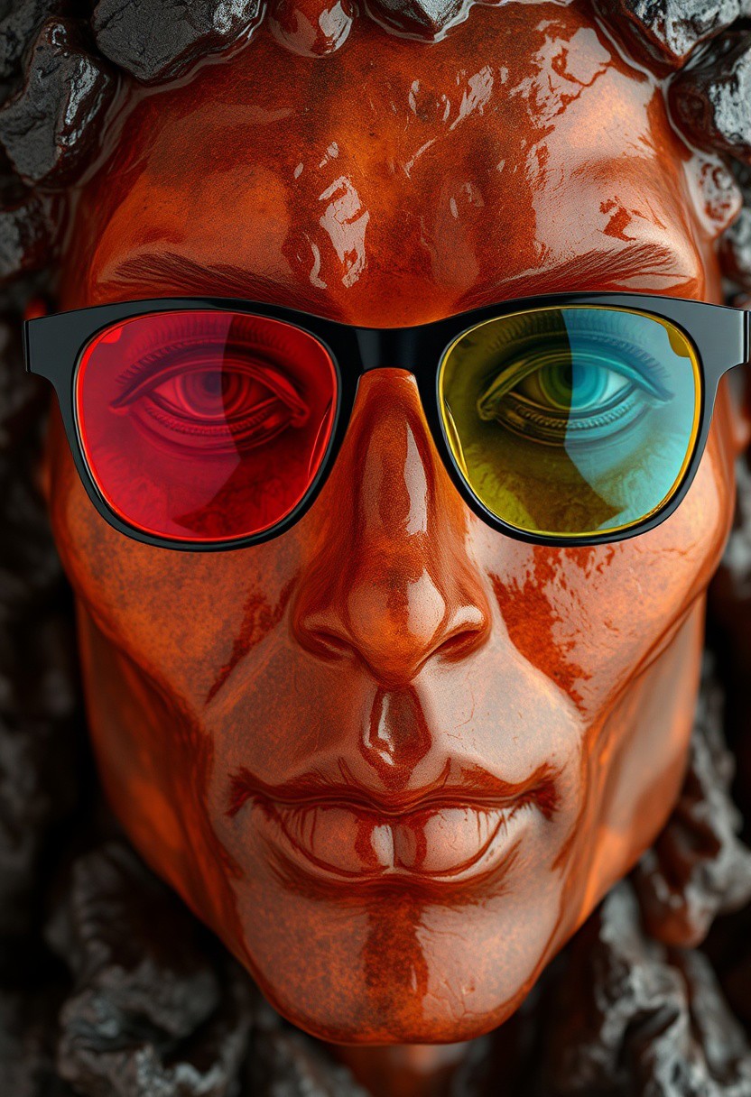 "Create a hyper-realistic image of a face composed of volcanic colored glass, with a rich, molten texture and a deep, earthy hue. The face is intricately detailed, with every facet and imperfection visible. The glass is carefully shaped to form a realistic facial structure, with subtle curves and angles that evoke a sense of depth and dimension. The face is wearing a pair of glasses with primary colored lenses - red, yellow, and blue - which add a pop of vibrant color to the image. The glasses are precisely rendered, with every detail from the frames to the lenses meticulously captured." highest-Quality, 8 k, intricate details, visually stunning, Masterpiece