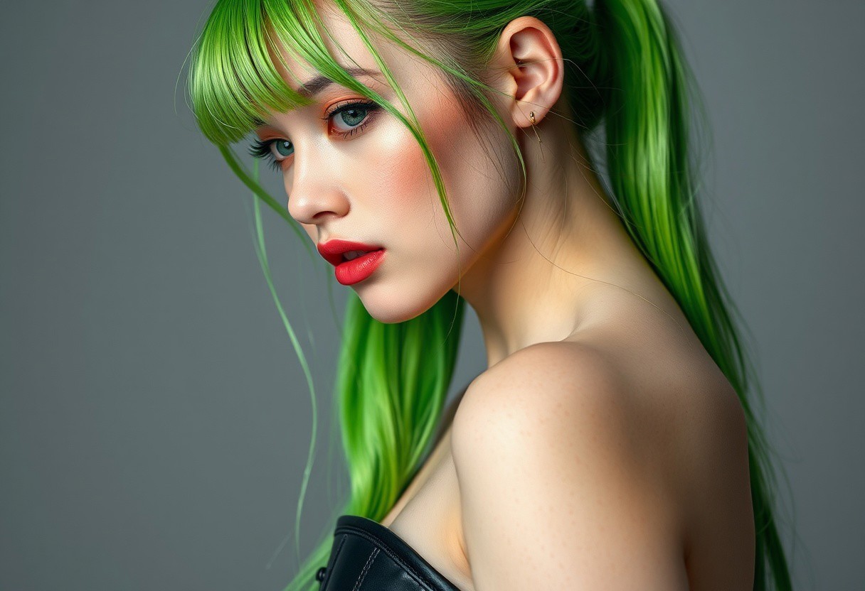 score_9, score_8_up, score_7_up, score_6_up, score_5_up, score_4_up, 1woman, RAW photo, (freckles:0.8), long ponytail, neon green hair, medium close-up shot side view, latex corset (busty 44d:1.5), extremely detailed, beautiful detailed green eyes, full lips, pale skin, neutral expression, neutral gray background, studio lighting , in the style of (kyuYong Eom:1.0)