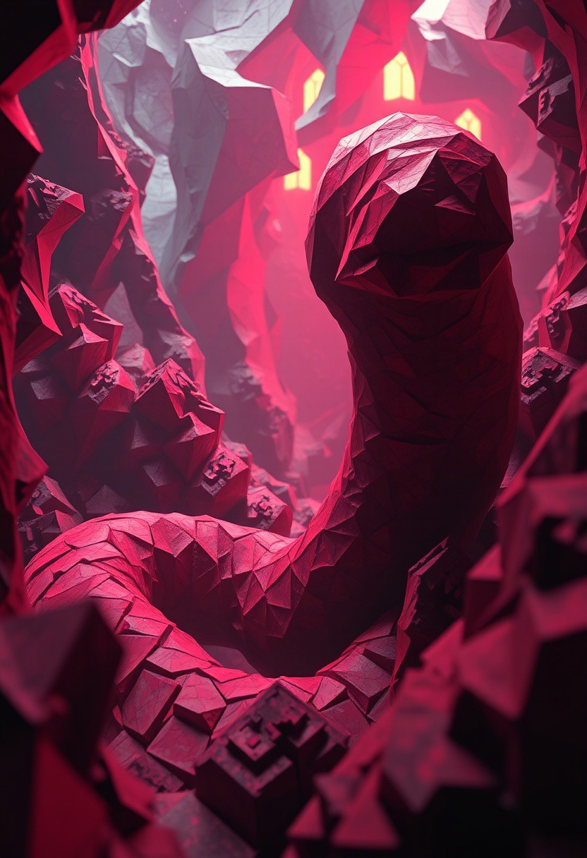 exaggerated curves, lower metazoan, psychedelic tones, unsettling, (polished:-1.3), (disjointed anatomy:-1.3), minimal details, intersecting planes of distorted reality, interlocking polygonal patterns, sharp and jagged structures, (low quality:-1.2), high resolution, stark lighting from unknown sources, infinite geometry, (ugly:-1.3), photorealism, saturated hues, raw, non-euclidean space, vibrant, angular geometric forms, fractal patterns in the environment, fragmented reality, earth worm, sculptural appearance, (bad composition:-1.3), (smooth surfaces:-1.4), (blurry:-1.2),worm, distorted space-time, (overly ornate:-1.5), (cartoonish:-1.1), intricate fractal structures, fractured space, neon glow, (soft lighting:-1.2), (emphasis on non-euclidean geometry:1.6), dystopian vibe, (noisy:-1.1), rigid geometric structure, primal aesthetic, brutal edges, (overloaded multichromatic colors:1.6), impossible geometry, recursive shapes, multichromatic colors