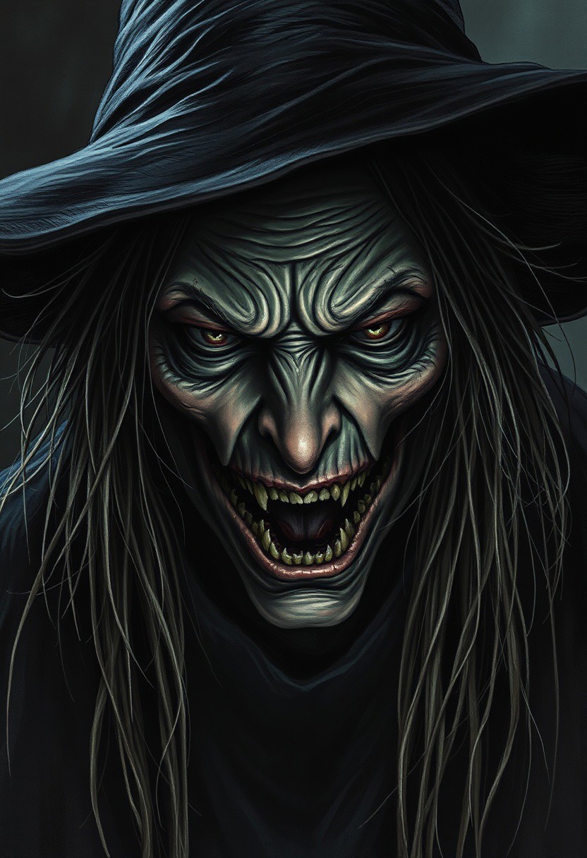 terrifying witch, (Brad Anderson horror style:1.4), unsettling atmosphere, eerie lighting, menacing expression, hollow eyes, (psychological horror:1.3), dark, grim background, haunting shadows, windblown hair, detailed realistic portrait, (high tension, fear-inducing:1.2), intense stare, (masterpiece:1.5), high quality, ultra-realistic, muted color palette