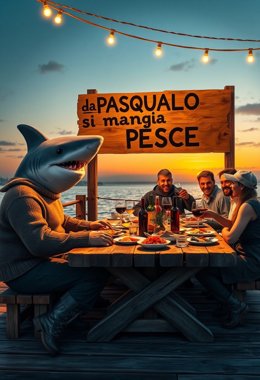 An Italianized humanoid shark named ‘Pasqualo,’ with a muscular body, gray shark-like skin, and sharp teeth, sits at a large wooden table on a seaside pier during sunset. He has black eyes, a prominent dorsal fin, and a friendly grin. Dressed in a rugged fisherman’s outfit, including a weathered wool sweater, rolled-up pants, and boots, Pasqualo blends seamlessly into the scene with his human fisherman friends. They laugh and chat around the table, their sun-baked skin and salt-worn clothes reflecting a life spent at sea. The table is covered with rustic Italian seafood dishes: grilled fish, steaming bowls of pasta, crusty bread, and wine bottles. Half-filled glasses suggest recent toasts, and plates are scattered in a laid-back, festive atmosphere. Overhead, warm string lights cast a golden glow on the gathering. In the background, a large wooden sign, slightly worn and hand-painted, reads ‘da PASQUALO si mangia PESCE.’ It’s mounted on a weathered post with a couple of seagulls perched on top. The sea behind them is calm, with fishing boats gently rocking in the harbor. The setting captures the authentic feel of an old Italian coastal town, with Pasqualo smiling and enjoying the meal with his closest friends, blending the fantastical with the familiar and realistic.