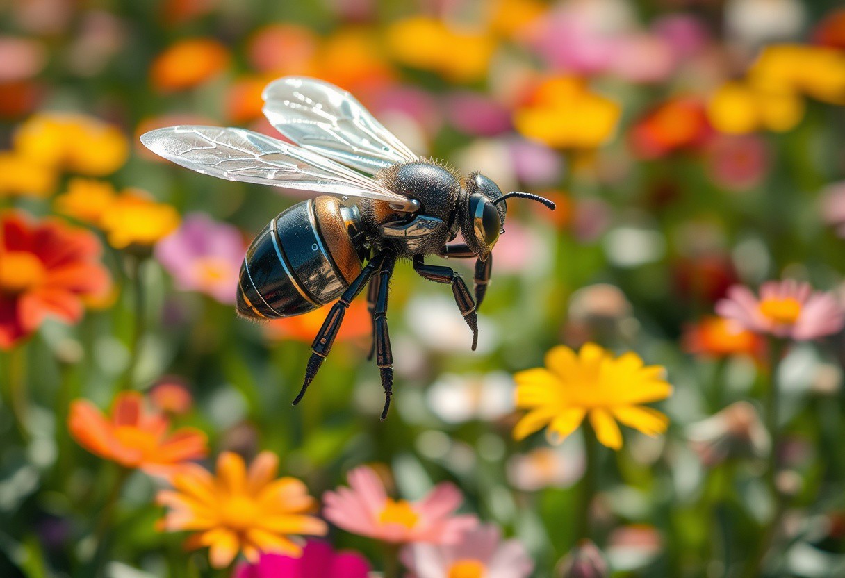 Imagine a close-up of a robotic bee hovering in mid-air, its delicate metal wings shimmering in the sunlight. Surrounding it is a vibrant garden filled with colorful flowers, each petal telling a story of life and beauty. The bee seems to dance gracefully, merging engineering precision with the elegance of nature. In this intersection of technology and the environment, we sense the human desire to harmonize innovation with the natural world.”
