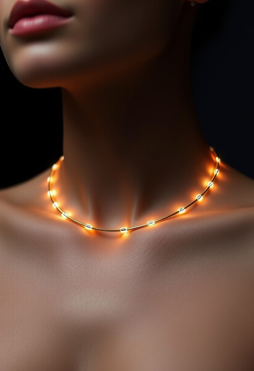 subdermal implanted LED jewelry, (natural glow beneath the skin:1.7), (embedded LEDs:1.6) forming the shape of a gold necklace under the skin, soft golden light radiating subtly from beneath the surface, (sapphire-like LED glow:1.5) highlighting the clavicle, seamlessly integrated into skin texture, high-definition, (warm natural skin tone:1.5), gentle, barely-visible subdermal LED lights, (flawless skin:1.8), ultra-realistic skin textures with soft light diffusion, (elegant under-the-skin jewelry:1.5), futuristic yet natural body modification, (glowing accents:1.6) subtly enhancing natural beauty, radiant skin with soft integrated lighting, advanced subdermal technology, smooth light transitions from beneath the skin, high-resolution, gentle blue glow mimicking sapphire without being overly luminous, delicate subdermal glow following the body's natural contours, refined, understated tech-based beauty, modern body modification