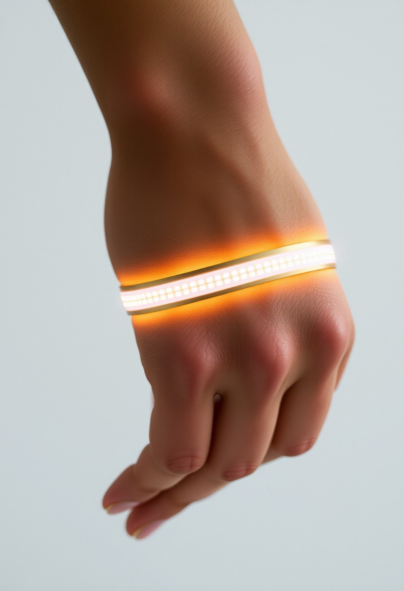 subdermal LED cuff bracelet, (internal LED glow:1.7), (embedded LEDs:1.7) forming an elegant band of light around the wrist, soft glow radiating evenly beneath the skin, (uniform light segments:1.6), (glowing light bands:1.6) mimicking the structure of a classic cuff bracelet, natural skin tone with seamless light diffusion, high-definition, (ultra-realistic skin texture:1.8), radiant light seamlessly integrated into the skin, perfect for both formal and everyday wear, (worn bracelet:-1.8), (visible cuff:-1.8), (unnatural glow:-1.5), smooth, refined light transitions, modern and bold, timeless elegance