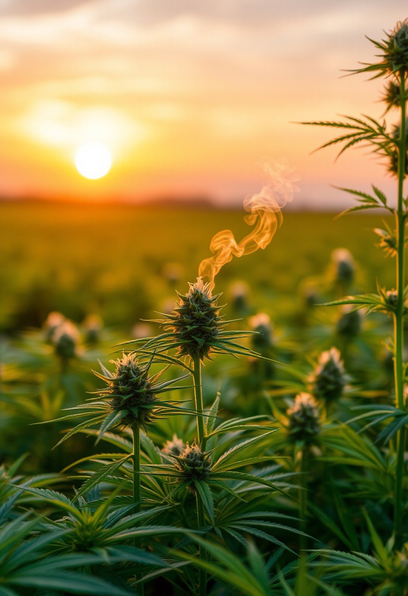vibrant cannabis field, (lush green leaves:1.4), (sunset glow:1.2) casting warm light over the plants, (detailed textures:1.5), smoke swirling softly in the air, (cannabis buds:1.3) glistening with trichomes, peaceful and serene atmosphere, (natural light:1.4), wide field stretching into the distance, (colorful sky:1.2) with shades of pink and orange, (high-definition:1.6), (ultra-realistic textures:1.5), close-up details of cannabis plants, (soft focus in the background:1.2), modern, laid-back aesthetic, perfect for a cannabis culture feature, chill and relaxed vibe, (overexposed:-1.4), (unnatural colors:-1.5), (blurry:-1.6), (low-resolution:-1.7), (harsh lighting:-1.5), (distorted textures:-1.6)