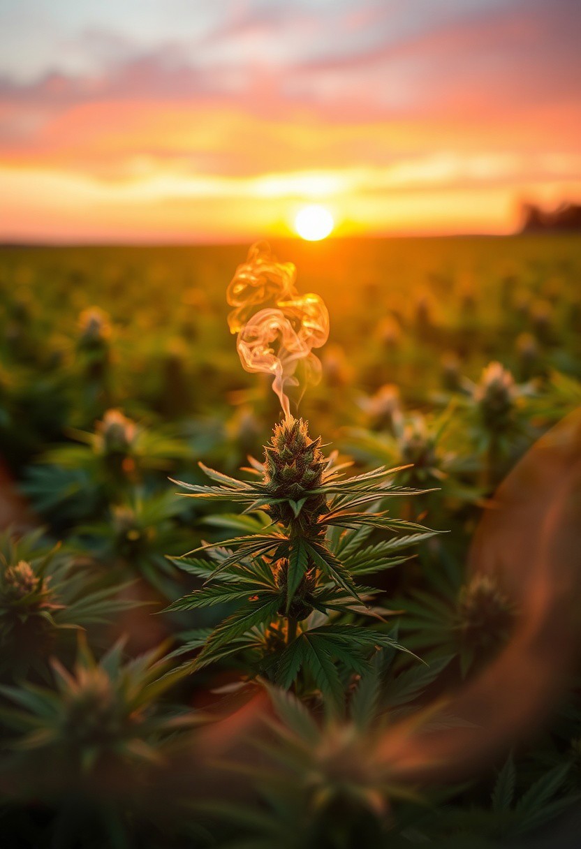 vibrant cannabis field, (lush green leaves:1.4), (sunset glow:1.2) casting warm light over the plants, (detailed textures:1.5), smoke swirling softly in the air, (cannabis buds:1.3) glistening with trichomes, peaceful and serene atmosphere, (natural light:1.4), wide field stretching into the distance, (colorful sky:1.2) with shades of pink and orange, (high-definition:1.6), (ultra-realistic textures:1.5), close-up details of cannabis plants, (soft focus in the background:1.2), modern, laid-back aesthetic, perfect for a cannabis culture feature, chill and relaxed vibe, (overexposed:-1.4), (unnatural colors:-1.5), (blurry:-1.6), (low-resolution:-1.7), (harsh lighting:-1.5), (distorted textures:-1.6)