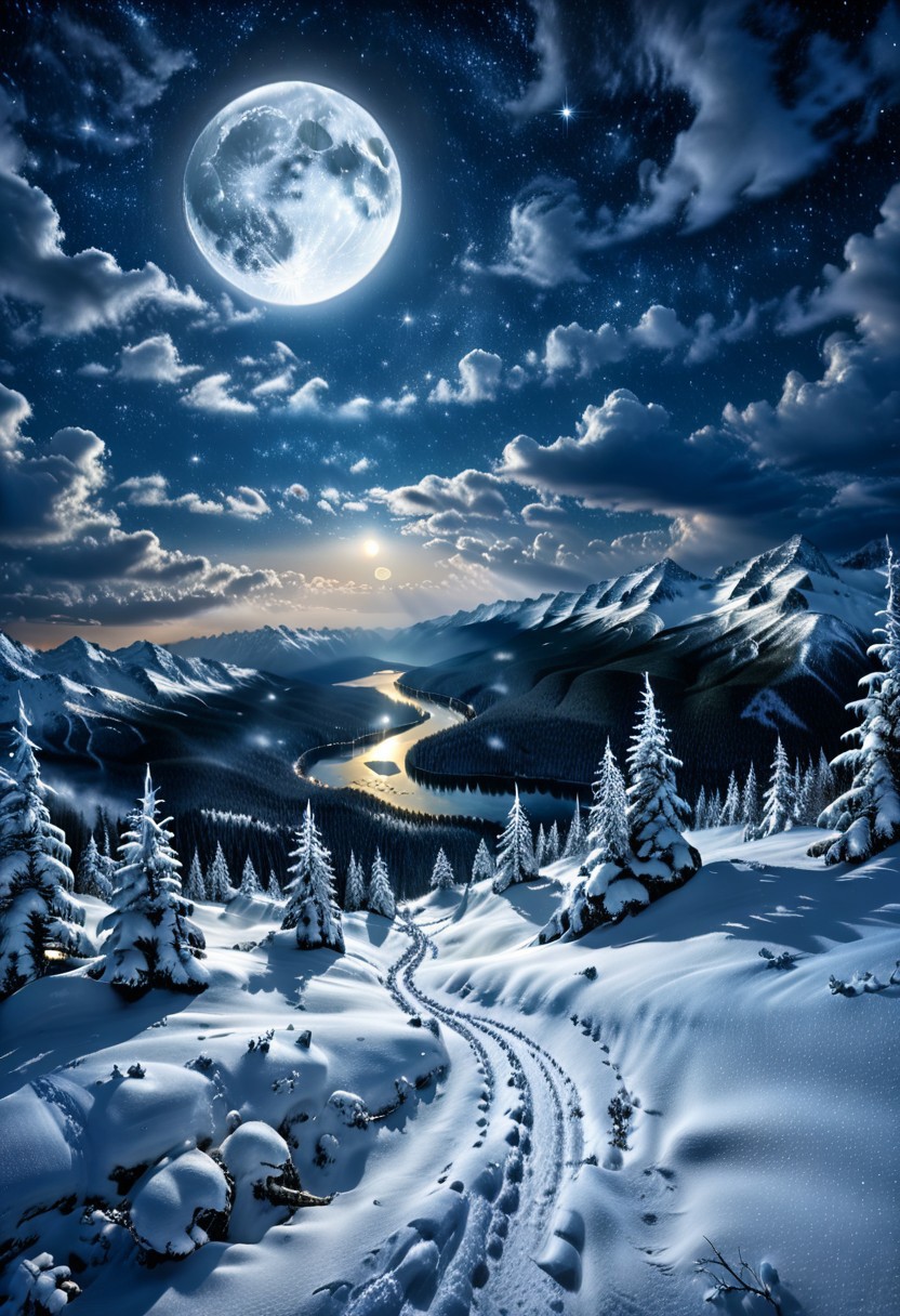 Majestic taiga covered with snow at night, bright stars twinkling in the sky, full moon illuminating the landscape, hyper-detailed, cinematic, serene atmosphere, stunning realism, by Thomas Kinkade and Ansel Adams, 4k resolution, masterpiece digital painting