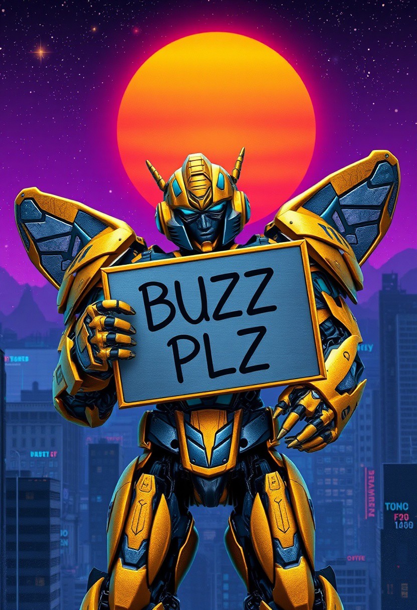 gold and blue Bumblebee transformer holding a sign that sys "BUZZ PLZ", photograph with a purple sky, cosmic stars, an orange and blue synthwave sun background. Slightly turned. Damascus steel. Ultra-detailed. Hyper-realistic. Metal city landscape