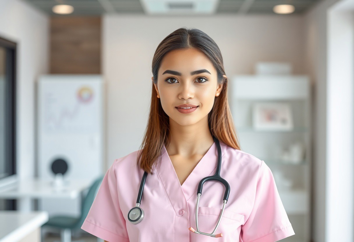medium shot, symmetrical front view of a Beautiful real young woman, pink clinic uniform, office work space at the background