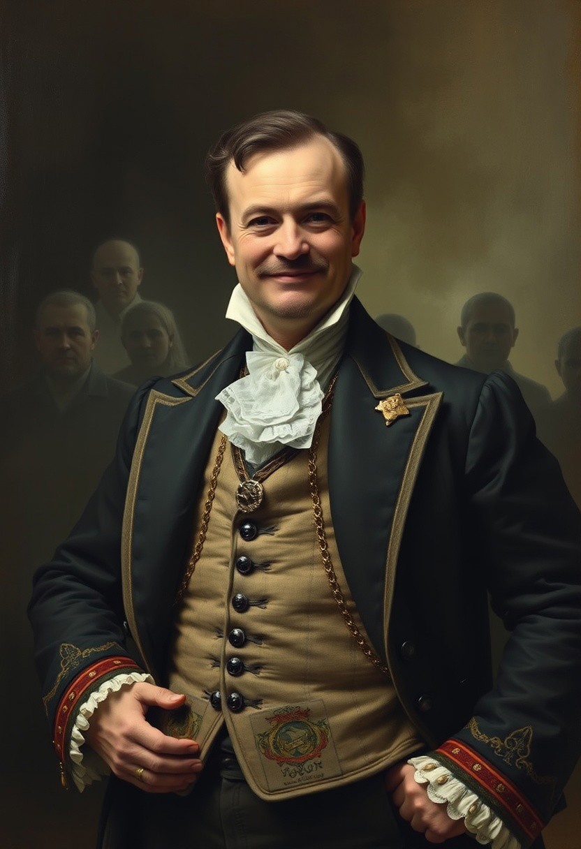 A traditional portrait painting in the style of John Singer Sargent or Francis Bacon. In the foreground, depict a wealthy, egotistical man in Victorian-era clothing, with a self-satisfied smirk. He should resemble an industrialist or factory owner, symbolizing greed and arrogance. His clothing is ornate and extravagant, emphasizing his wealth. He stands in a commanding pose, exuding an air of superiority. He surrounded by unearned wealth and oppulance. In the background, faintly visible through a ghostly mist, are the shadowy, spectral figures of workers—men and women. They are ghostly apparitions oh a ghostly mist, are the shadowy, spectral figures of worf the laborers who have died building his fortune. These figures are haunting but subdued, as if emerging from the shadows, watching him silently. The overall tone of the painting should feel dark, gothic, and unsettling, with muted, cold colors like deep greens, grays, and blacks dominating the palette. It should feel haunted by death and unsettling.