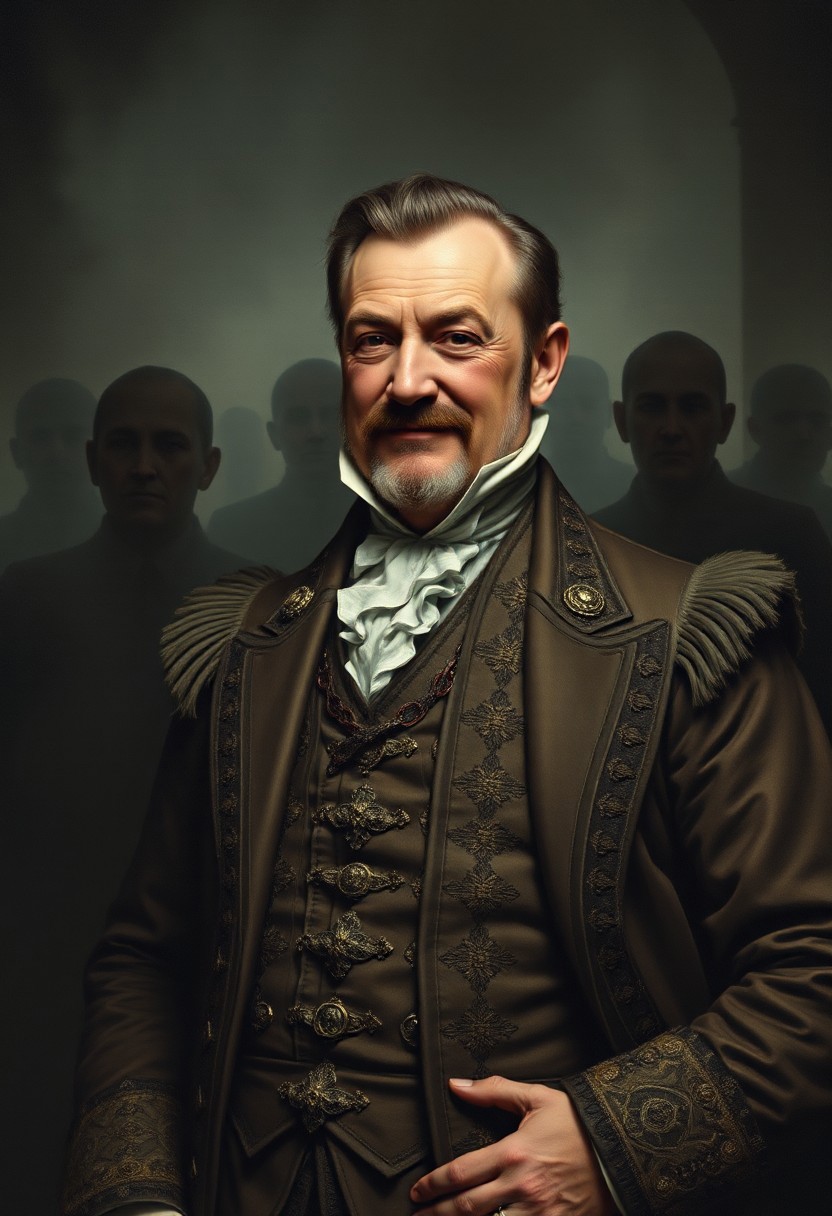 A traditional portrait painting in the style of John Singer Sargent or Francis Bacon. In the foreground, depict a wealthy, egotistical man in Victorian-era clothing, with a self-satisfied smirk. He should resemble an industrialist or factory owner, symbolizing greed and arrogance. His clothing is ornate and extravagant, emphasizing his wealth. He stands in a commanding pose, exuding an air of superiority. He surrounded by unearned wealth and oppulance. In the background, faintly visible through a ghostly mist, are the shadowy, spectral figures of workers—men and women. They are ghostly apparitions oh a ghostly mist, are the shadowy, spectral figures of worf the laborers who have died building his fortune. These figures are haunting but subdued, as if emerging from the shadows, watching him silently. The overall tone of the painting should feel dark, gothic, and unsettling, with muted, cold colors like deep greens, grays, and blacks dominating the palette. It should feel haunted by death and unsettling.