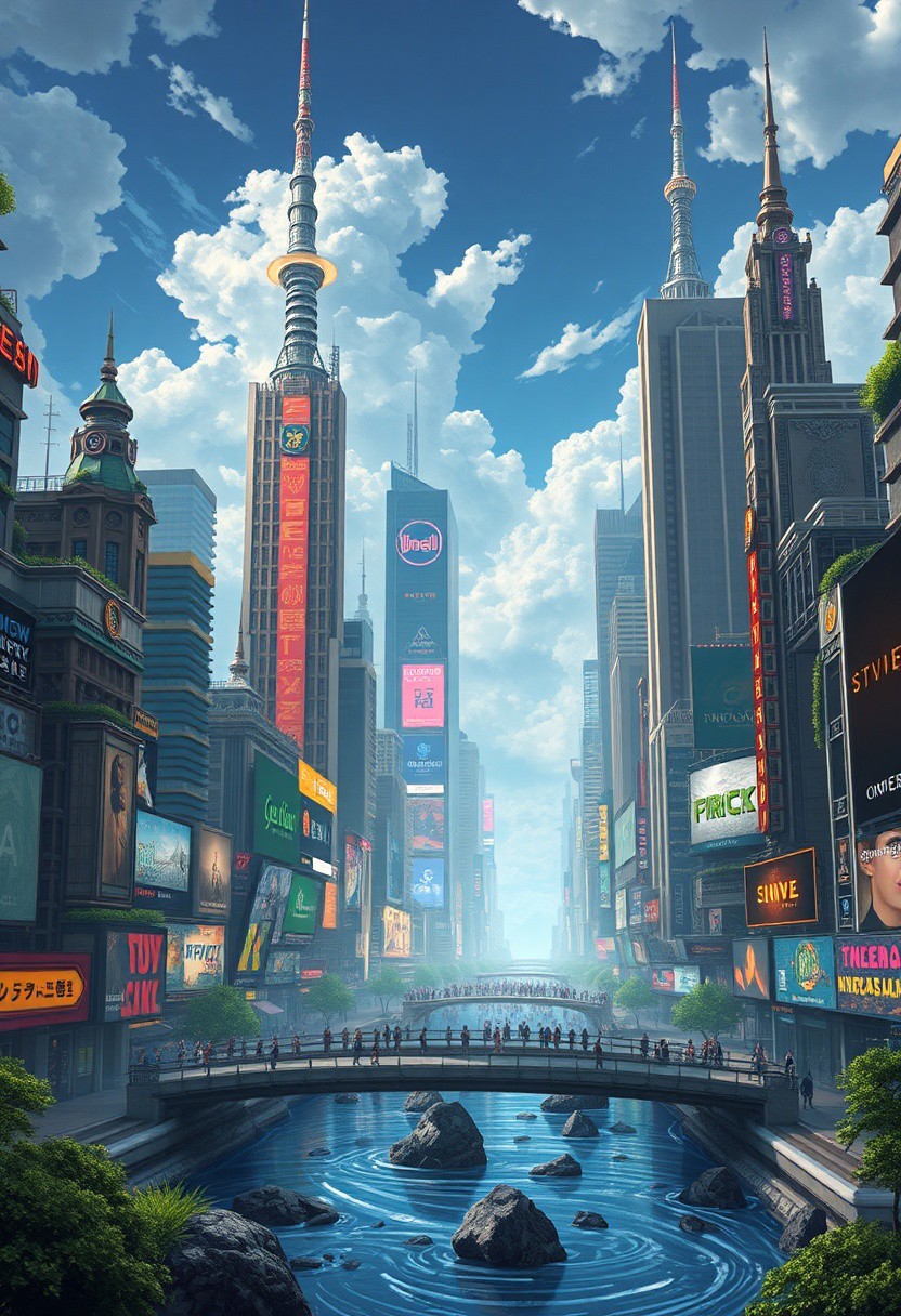 Landscape of a futuristic elvish solarpunk sci-fi city reminiscent of Times Square with tall towers and futuristic skyscrapers, tasteful advertising, surreal colours, detailed sky with greenery and flowing water