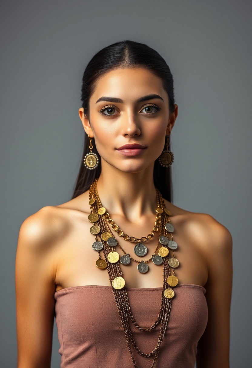 symmetrical front view, front view, beautiful woman with her left bare shoulder covered with jewelry made with coins and chains, grey background studio