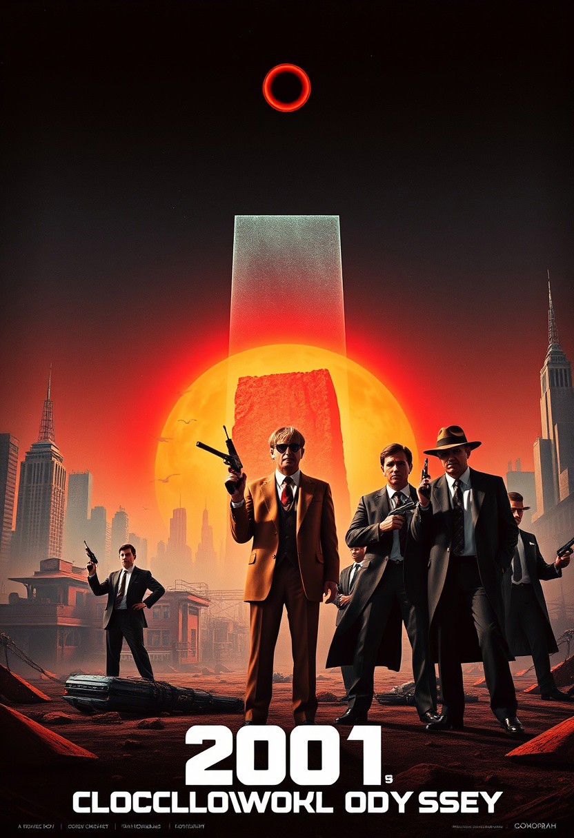 Design a surreal movie poster for 2001: CLOCKWORK ODYSSEY, blending A Clockwork Orange, 2001: A Space Odyssey, Reservoir Dogs, Gone with the Wind, The Untouchables, and Gomorrah. In the foreground, Alex from A Clockwork Orange stands alongside sharply dressed gangsters from Reservoir Dogs and The Untouchables, holding futuristic weapons. Add gritty, modern criminals from Gomorrah, injecting a raw, urban vibe. The background merges the sterile space of 2001—with HAL 9000’s red eye and the monolith—against a burning sunset from Gone with the Wind. The landscape should blend urban decay from Gomorrah and Clockwork Orange with 1930s Chicago architecture from The Untouchables and the futuristic setting of 2001. Scarlett O’Hara stands elegantly beside the rough mobsters, contrasting romance and violence. The color palette should mix the cold blues of 2001, warm reds from Gone with the Wind, and the dark, gritty tones from Gomorrah. The title 2001: CLOCKWORK ODYSSEY should blend classic and bold typography. Include ‘A Film by Stanley Kubrick’ at the bottom, capturing the blend of dystopia, crime, romance, and sci-fi.”