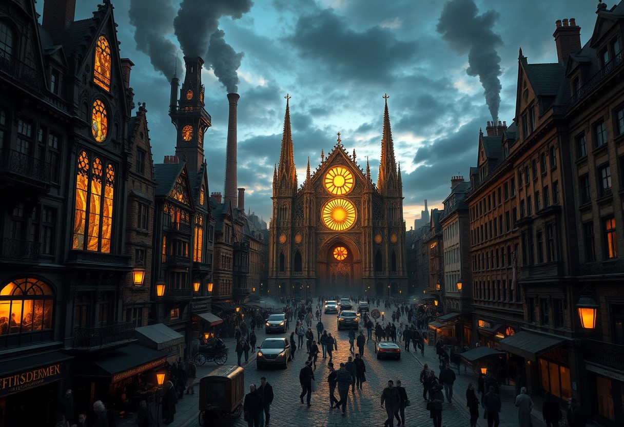 A bustling European city inspired by Victorian-era industrial architecture. Intricate ironwork, soot-covered stone facades, and towering chimneys spew smoke over the busy cobblestone streets filled with mechanized carriages and bustling crowds. At the city's heart stands a grand fantasy cathedral dedicated to the God of the Eternal Blazing Sun. Its radiant golden spires rise toward the sky, while stained glass windows depict celestial scenes, casting divine light across the square. The cathedral’s gothic arches and sun symbols glow with an ethereal energy. The central sun disk hovers, radiating warm light, a stark contrast to the surrounding dark, soot-covered buildings. The city’s gas lamps flicker against the rough stone, while the cathedral glows with divine radiance. The mix of industrial grit and divine beauty creates a striking atmosphere as the city comes alive beneath the dramatic evening sky. As dusk falls, the celestial aura intensifies, casting long shadows, while distant bells chime, summoning worshippers toward the golden-lit pathways of the cathedral. Ultra-realistic, 32k, Masterpiece, High Quality, with High Detailed Skin and Realistic Lighting, capturing the beautiful, intricate background in stunning detail. Official art, emphasizing epic, detailed realism. (Ultra Realistic:1.0), 32k, (Masterpiece:1.0), (High Detailed Skin:1.0), (High Quality:1.0), (Detailed Realistic Background:1.3), (Official Art, Beautiful:1.2), (Realistic Lighting:1.0).