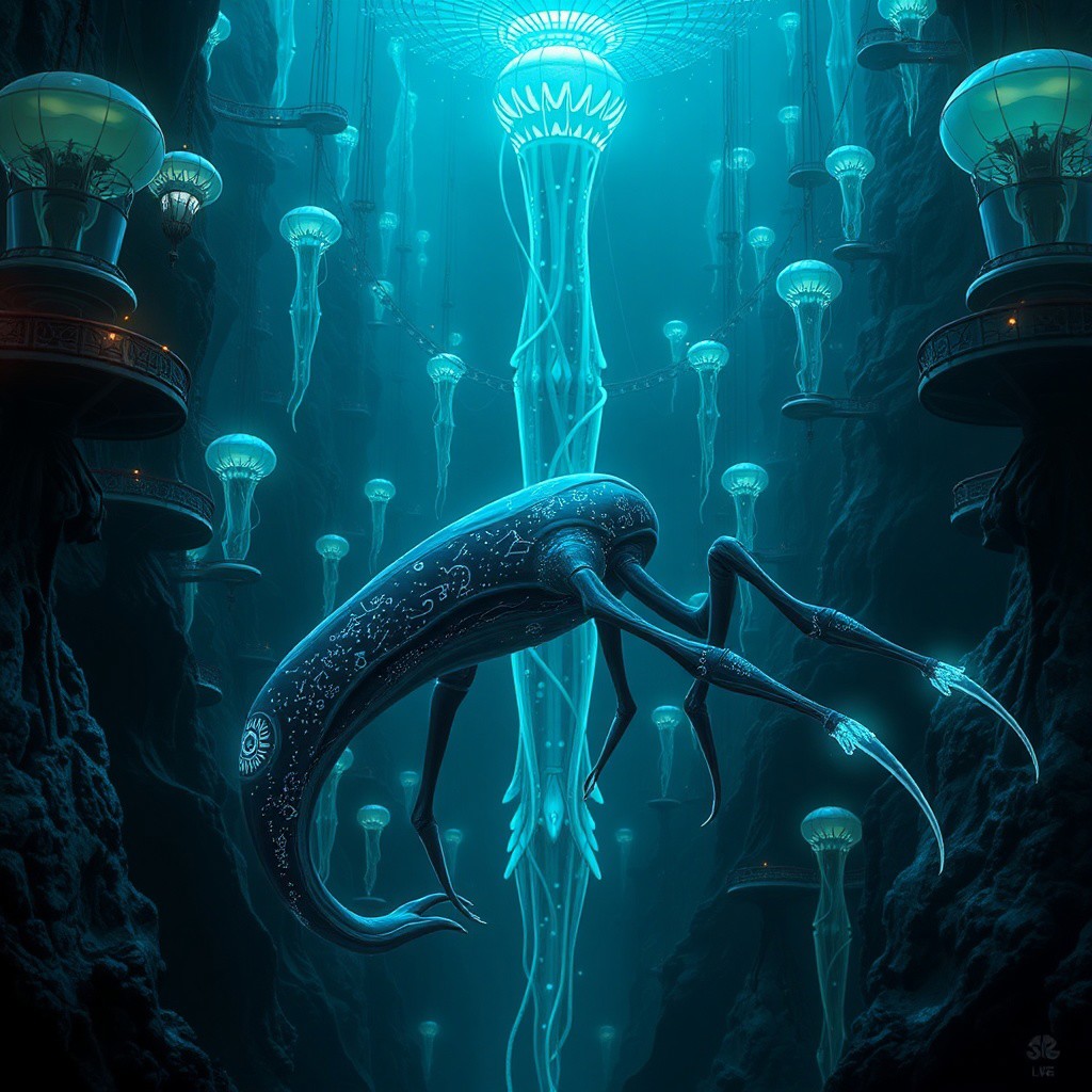 (Ultra-realistic, 32k, Masterpiece, High Quality, Detailed Realistic Background, Official Art, Realistic Lighting). Illustrate an Abyssal Navigator, an enigmatic, deep-sea alien species adapted to thrive in the crushing depths of a distant oceanic world. Their sleek, elongated bodies are covered in bioluminescent patterns resembling intricate constellations, with dark, smooth skin designed to withstand extreme pressure. The Abyssal Navigator’s appendages are both delicate and powerful, ending in glowing, webbed fingers that help them navigate the dark, unfathomable depths. Their habitat is a vast, abyssal trench filled with towering, bioluminescent spires and floating architecture. These structures, crafted from iridescent, pressure-resistant alloys, resemble twisted coral reefs and towering jellyfish, radiating a faint glow that illuminates the inky blackness. Suspended platforms and arched bridges link the spires, providing both functionality and aesthetic beauty. The faint light from the glowing architecture and the deep ocean creates a hauntingly beautiful and ethereal atmosphere, with cinematic dark lighting capturing the depth and majesty of their underwater world."