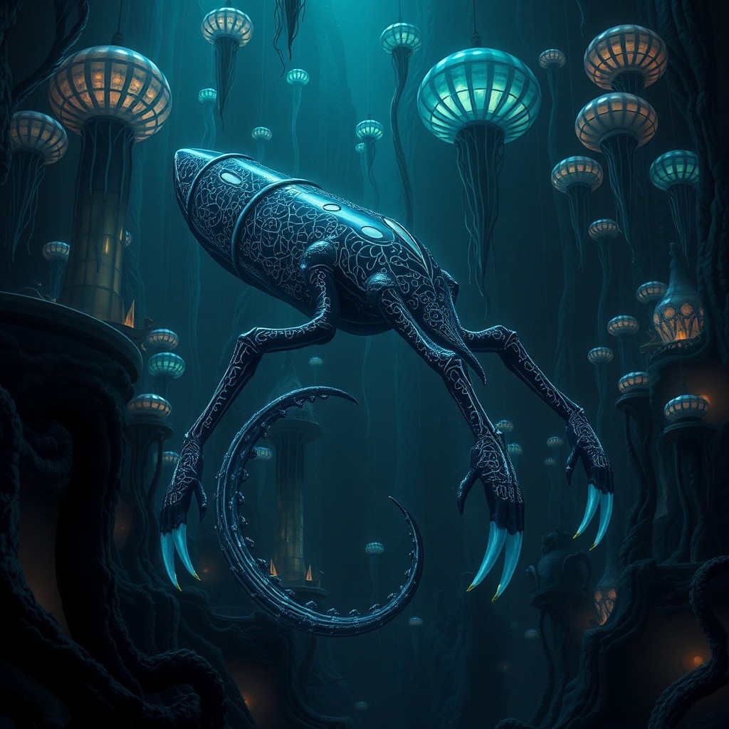 (Ultra-realistic, 32k, Masterpiece, High Quality, Detailed Realistic Background, Official Art, Realistic Lighting). Illustrate an Abyssal Navigator, an enigmatic, deep-sea alien species adapted to thrive in the crushing depths of a distant oceanic world. Their sleek, elongated bodies are covered in bioluminescent patterns resembling intricate constellations, with dark, smooth skin designed to withstand extreme pressure. The Abyssal Navigator’s appendages are both delicate and powerful, ending in glowing, webbed fingers that help them navigate the dark, unfathomable depths. Their habitat is a vast, abyssal trench filled with towering, bioluminescent spires and floating architecture. These structures, crafted from iridescent, pressure-resistant alloys, resemble twisted coral reefs and towering jellyfish, radiating a faint glow that illuminates the inky blackness. Suspended platforms and arched bridges link the spires, providing both functionality and aesthetic beauty. The faint light from the glowing architecture and the deep ocean creates a hauntingly beautiful and ethereal atmosphere, with cinematic dark lighting capturing the depth and majesty of their underwater world."