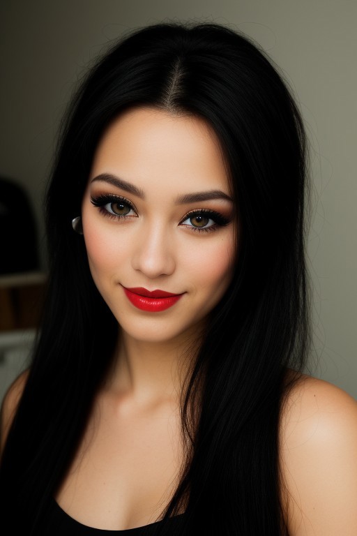 RAW photo, woman, 30 years old, Caucasian, pale skin, very long hair, red hair, straight hair, hair over one eye, dark green eyes, sensual red lips, black eyeshadow, rouge, black mascara, black eyeliner, long black lace classy dress, looking at viewer, naughty face, seductive smile, 8k uhd, dslr, soft lighting, high quality, film grain, Fujifilm XT3