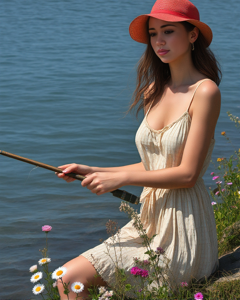 a hyperrealistic image with extreme details of a woman fishing on the banks of a lake. It is summer and there are flowers and other vegetation around her. She is holding a fishing rod with the fishing line in the water. She has small breasts and is wearing a summer dress.