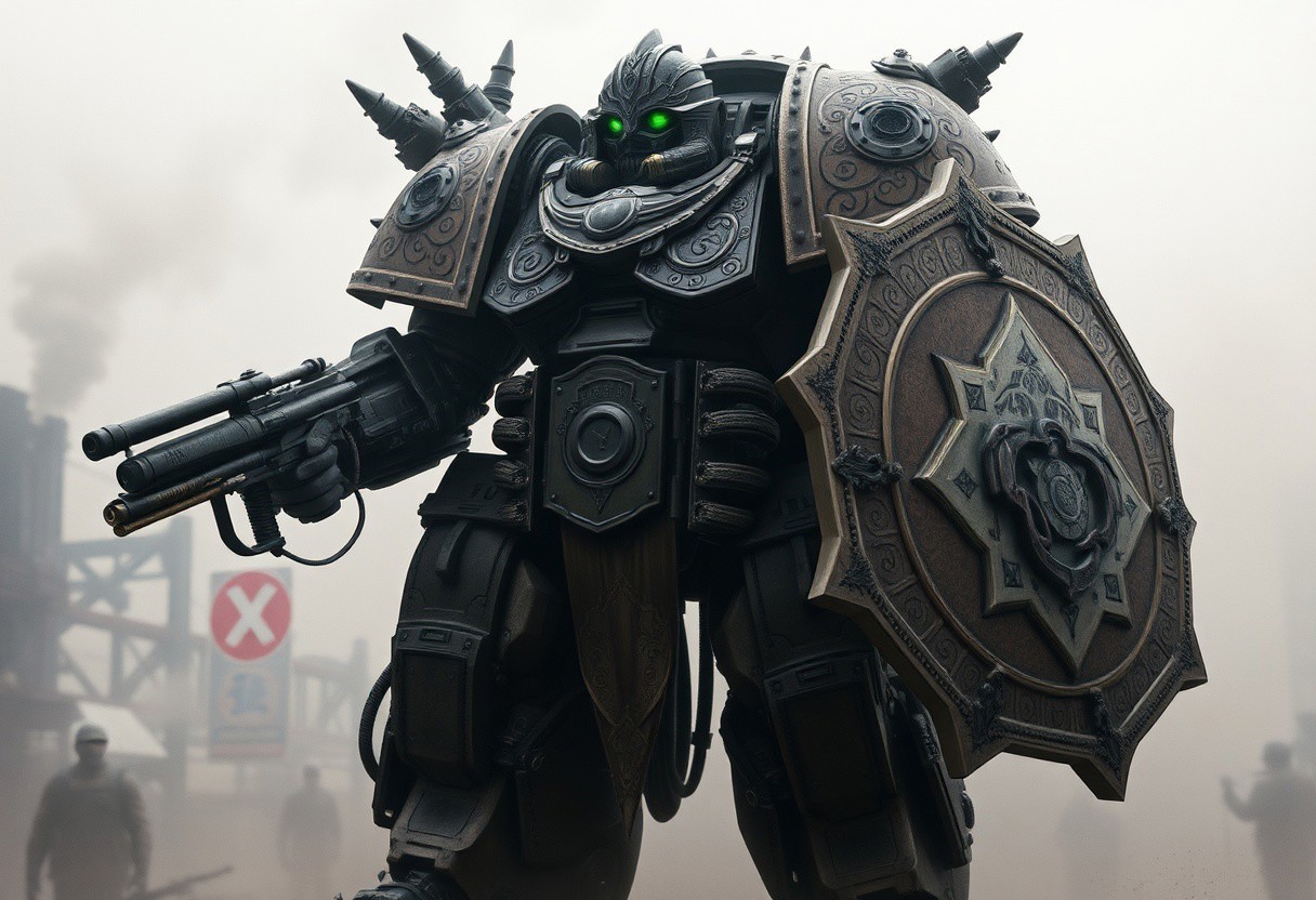 A hulking Armor Warrior, inspired by the might of a Space Marine, strides through a smog-choked industrial dystopia. Clad in a fusion of ornate Victorian armor and an industrial-powered exoskeleton, the warrior exudes a blend of old-world grandeur and brutal efficiency. Towering over common soldiers, its frame is reinforced by riveted iron plates etched with intricate Victorian scrollwork, while mechanical pistons and gears hum beneath, driving its every motion. The warrior’s helmet, a grim fusion of gothic architecture and advanced tech, features a cold, statuelike faceplate with glowing cybernetic eyes. Massive shoulder pauldrons bear the sigil of the Lord of the Storm, while steam hisses from vents on its back, releasing pressure as hydraulic limbs move with precision and power. In one gauntleted hand, the warrior wields an oversized industrial gun, crackling with energy and ready for combat, while the other holds a storm shield adorned with the radiant symbol of a storm god. Cybernetic enhancements reinforce its joints, granting the warrior superhuman strength and endurance. Behind, an industrial city looms—towering smokestacks and crumbling Victorian structures stretch into the stormy sky. Massive iron machines belch smoke as lightning dances among the clouds. The Armor Warrior stands as a sentinel of this dystopian world, embodying the brutal union of flesh, machine, and divine power in a time when technology and the gods are inseparable.