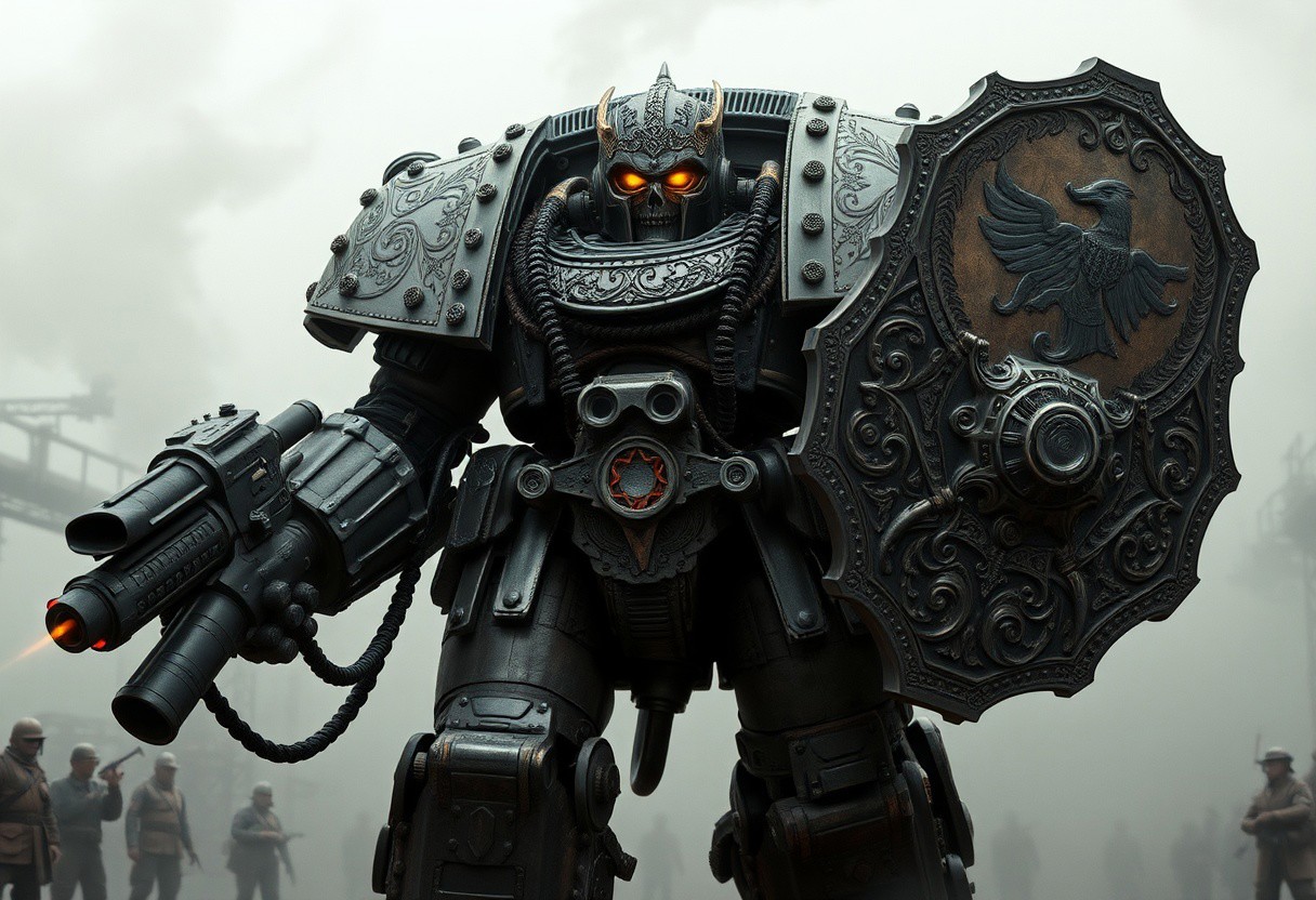 A hulking Armor Warrior, inspired by the might of a Space Marine, strides through a smog-choked industrial dystopia. Clad in a fusion of ornate Victorian armor and an industrial-powered exoskeleton, the warrior exudes a blend of old-world grandeur and brutal efficiency. Towering over common soldiers, its frame is reinforced by riveted iron plates etched with intricate Victorian scrollwork, while mechanical pistons and gears hum beneath, driving its every motion. The warrior’s helmet, a grim fusion of gothic architecture and advanced tech, features a cold, statuelike faceplate with glowing cybernetic eyes. Massive shoulder pauldrons bear the sigil of the Lord of the Storm, while steam hisses from vents on its back, releasing pressure as hydraulic limbs move with precision and power. In one gauntleted hand, the warrior wields an oversized industrial gun, crackling with energy and ready for combat, while the other holds a storm shield adorned with the radiant symbol of a storm god. Cybernetic enhancements reinforce its joints, granting the warrior superhuman strength and endurance. Behind, an industrial city looms—towering smokestacks and crumbling Victorian structures stretch into the stormy sky. Massive iron machines belch smoke as lightning dances among the clouds. The Armor Warrior stands as a sentinel of this dystopian world, embodying the brutal union of flesh, machine, and divine power in a time when technology and the gods are inseparable.