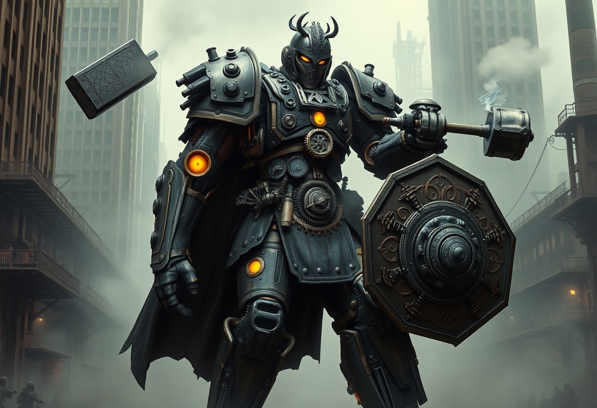 A towering Armor Warrior strides through the smog-filled streets of an industrial dystopia. Its form is a seamless blend of Victorian-era elegance and brutal industrial engineering, with gears, pistons, and steam vents integrated into its armor. Ornate ironwork and tarnished brass plates protect its body, while glowing cybernetic enhancements pulse along its limbs. A dark cloak billows behind, partially concealing the intricate gears and steam-powered mechanisms embedded in its back. The warrior’s helmet, crafted from blackened steel, features rivets and intricate Victorian scrollwork, with glowing cybernetic eyes scanning the desolate streets. Its gauntlets, reinforced with mechanical joints, enhance its immense strength and precision. In one hand, it wields a massive industrial hammer, crackling with electricity, while the other grips a mechanical shield, etched with the sigil of a forgotten empire. Steam hisses from its armor as it moves, releasing bursts of pressure. The landscape is bleak—towering iron skyscrapers loom above, and smokestacks spew black smoke into the dark sky. Flickering gas lamps cast a dim glow through the fog. In this world of iron and fire, the Armor Warrior stands as a symbol of the industrial age merged with dystopian cybernetics. Its presence embodies the convergence of Victorian aesthetics, industrial revolution grit, and cybernetic enhancement—a warrior of a forgotten era, now a force in a mechanical, dystopian age.