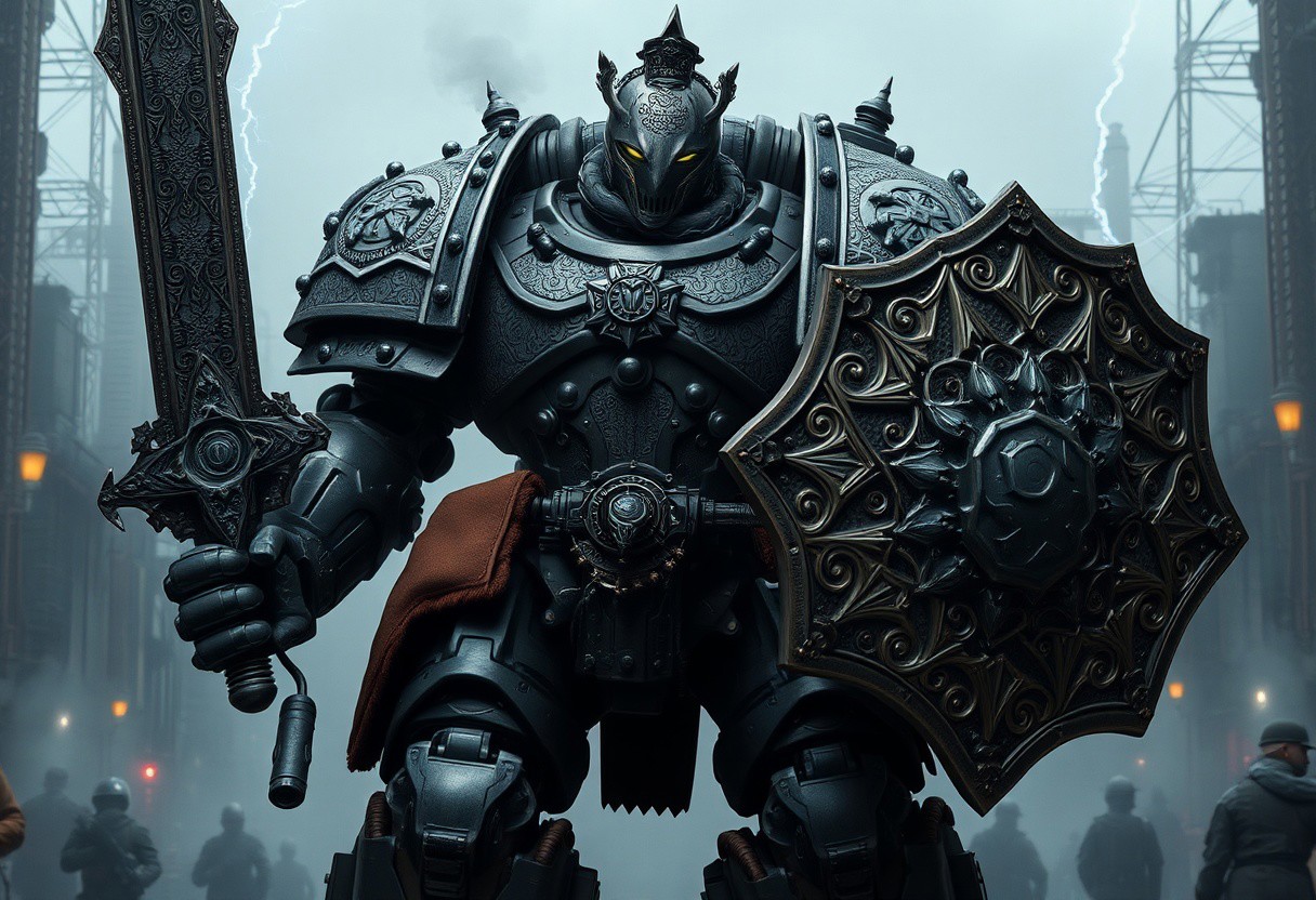 A hulking Armor Warrior, inspired by the might of a Space Marine, strides through a smog-choked industrial dystopia. Clad in a fusion of ornate Victorian armor and an industrial-powered exoskeleton, the warrior exudes a blend of old-world grandeur and brutal efficiency. Towering over common soldiers, its frame is reinforced by riveted iron plates etched with intricate Victorian scrollwork, while mechanical pistons and gears hum beneath, driving its every motion. The warrior’s helmet, a grim fusion of gothic architecture and advanced tech, features a cold, statuelike faceplate with glowing cybernetic eyes. Massive shoulder pauldrons bear the sigil of the Lord of the Storm, while steam hisses from vents on its back, releasing pressure as hydraulic limbs move with precision and power. One gauntleted hand grips an oversized industrial sword, crackling with arcs of lightning, while the other holds a storm shield adorned with the radiant symbol of a storm god. Cybernetic enhancements reinforce its joints, granting the warrior superhuman strength and endurance. Behind, an industrial city looms—towering smokestacks and crumbling Victorian structures stretch into the stormy sky. Massive iron machines belch smoke as lightning dances among the clouds. The Armor Warrior stands as a sentinel of this dystopian world, embodying the brutal union of flesh, machine, and divine power in a time when technology and the gods are inseparable.