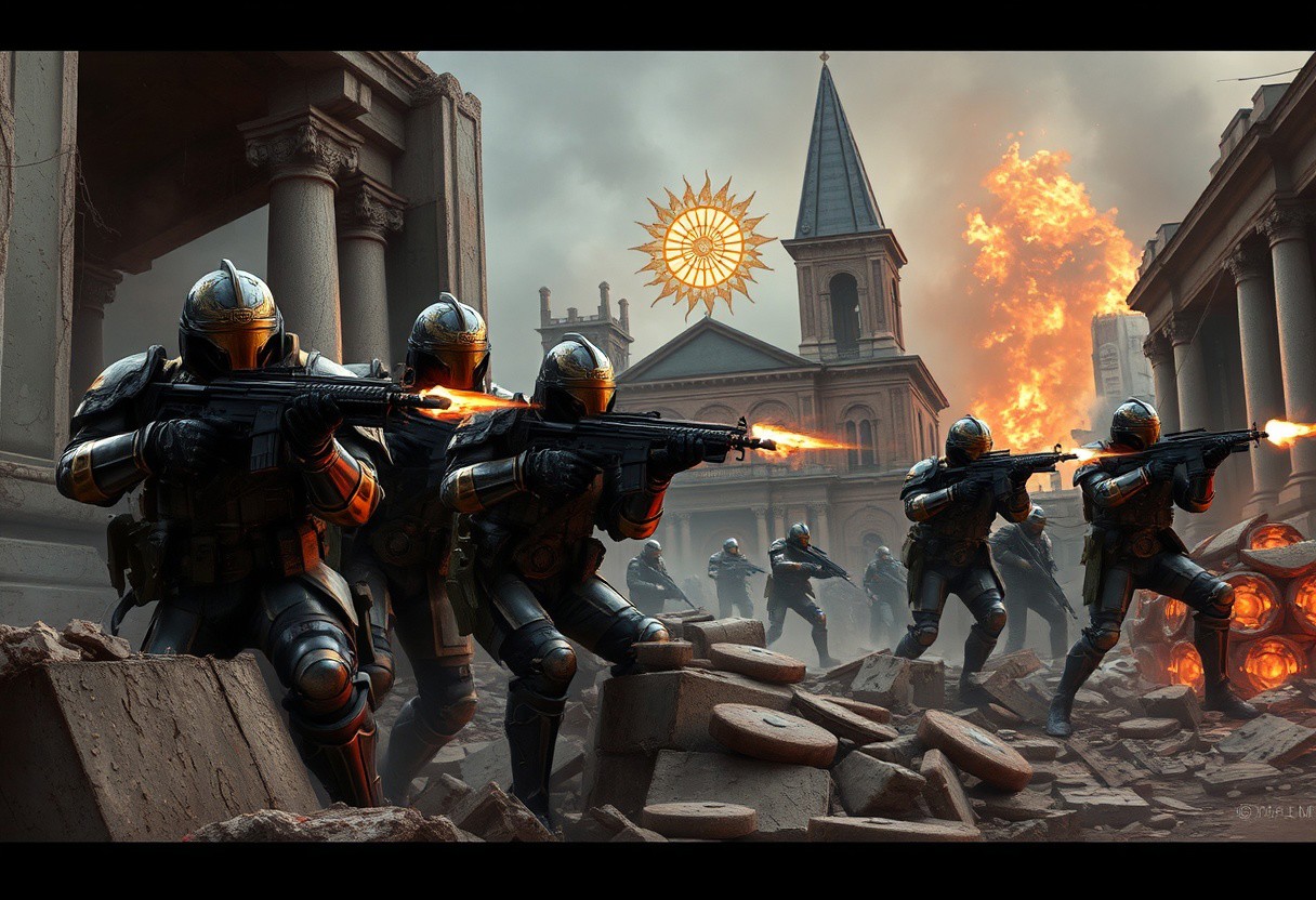 Armored warriors positioned in urban battlefield, holding their ground amid the crumbling cityscape. Sun insignia armor gleaming, blending Victorian craftsmanship and modern combat tech. Team wields rifles and machine guns, firing from behind barricades, concrete, and debris. Church of the Blazing Sun looms in the background, sacred symbol glowing amid the chaos and flames. Coordinated defensive maneuvers, firing strategically against advancing enemies. Heavy gunfire echoes through the war-torn streets, maintaining a firm hold on their position. Smoke and ash hang over the battlefield, casting long shadows over the defenders. Rifles trained, enemy soldiers closing in, yet the warriors stand their ground. Barricaded near the church, tactical movements keep enemies at bay. Sacred architecture threatened, but the warriors fight to the last, honoring their duty to protect the Church of the Blazing Sun. Sunburst and radiant symbols mark their armor and weapons, representing their devotion. Flashing muzzle fire, bursts of machine gun fire from behind shattered columns. Urban warfare, a mix of tactical defense and unwavering faith.