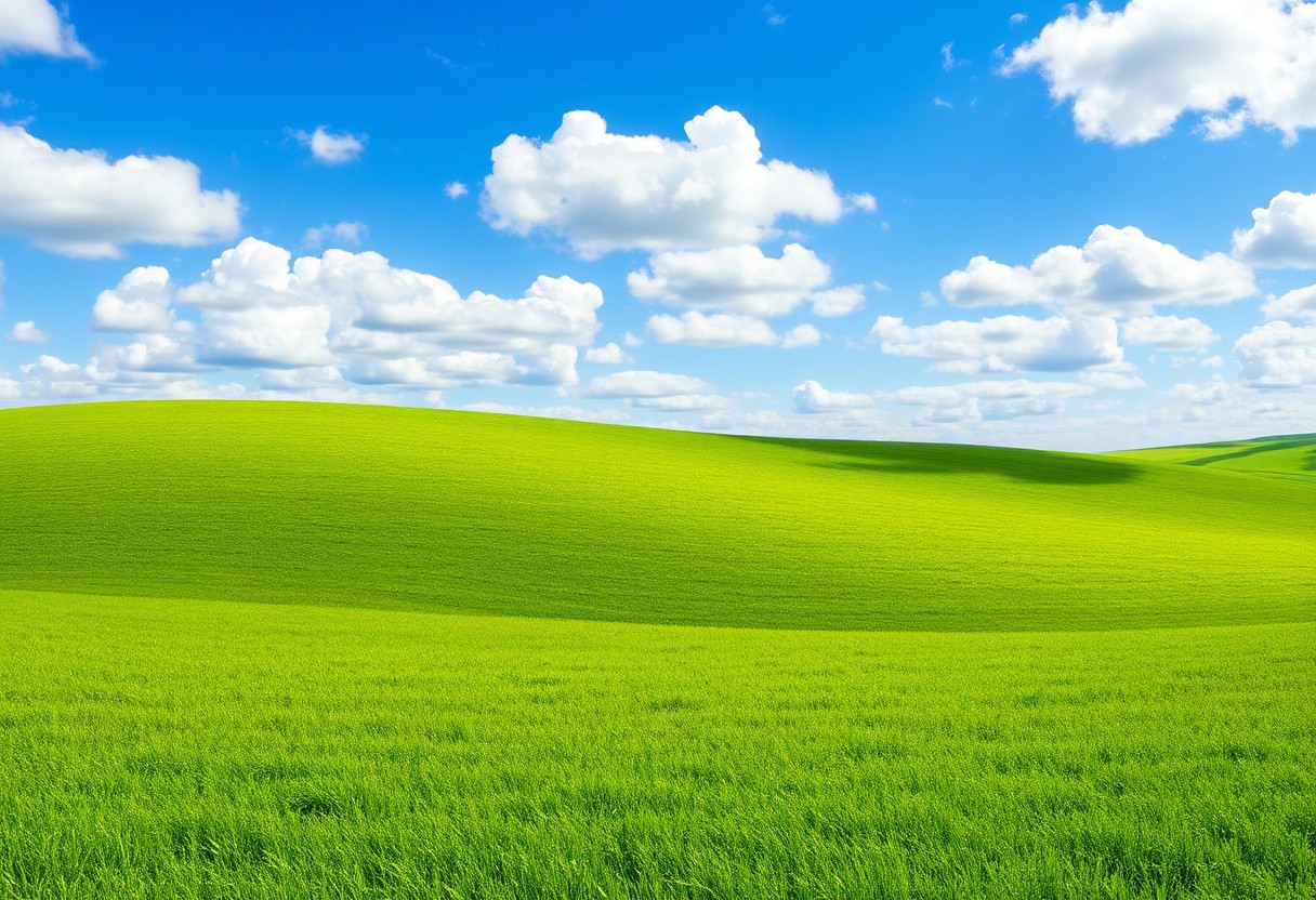 lush green field, iconic rolling hills, bright and vibrant green grass stretching far into the horizon, blue sky with scattered fluffy clouds, clear and sunny day, high-resolution, ultra-realistic textures, serene and peaceful atmosphere, vast open landscape, inspired by the classic Windows wallpaper, soft gentle slopes, minimalistic yet beautiful, perfect symmetry in nature, tranquil and calming mood, (blurry details:-1.6), (overexposed lighting:-1.5), (dull colors:-1.5), (flat composition:-1.4), (urban elements:-1.6)