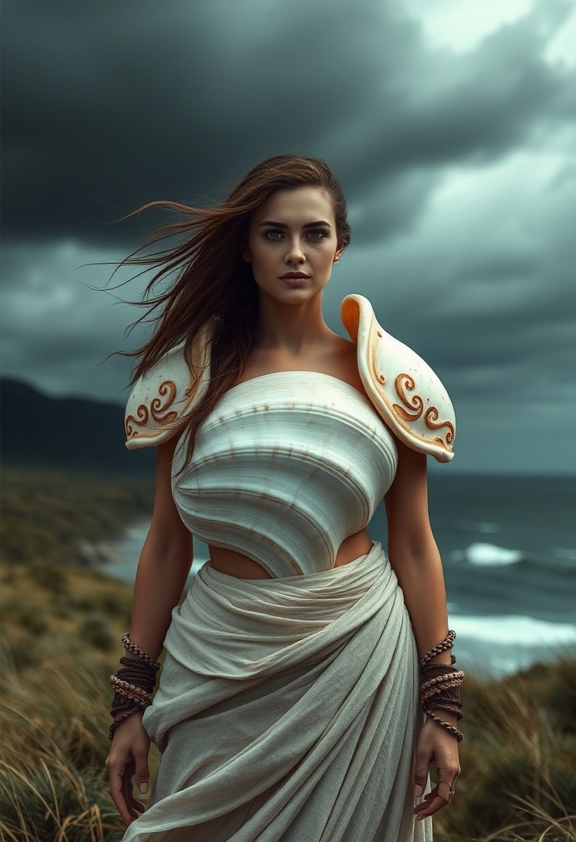 A regal woman stands in a windswept landscape near the sea, her body protected by a single, oversized seashell that wraps around her chest and shoulders like armor. The shell has a faint iridescent glow, and its natural curves mimic the movement of the ocean. Dark storm clouds roll in above her, while the light creates intense highlights across the shell's surface.