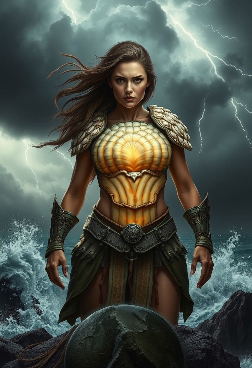 A fierce warrior woman stands atop a windswept cliff, her chest encased in a massive shell breastplate that radiates a soft, inner glow. The storm clouds behind her are thick and heavy, with bolts of lightning illuminating the scene. The waves below seem to echo the turbulence in the sky, crashing wildly against the rocks as she stares ahead with calm determination.