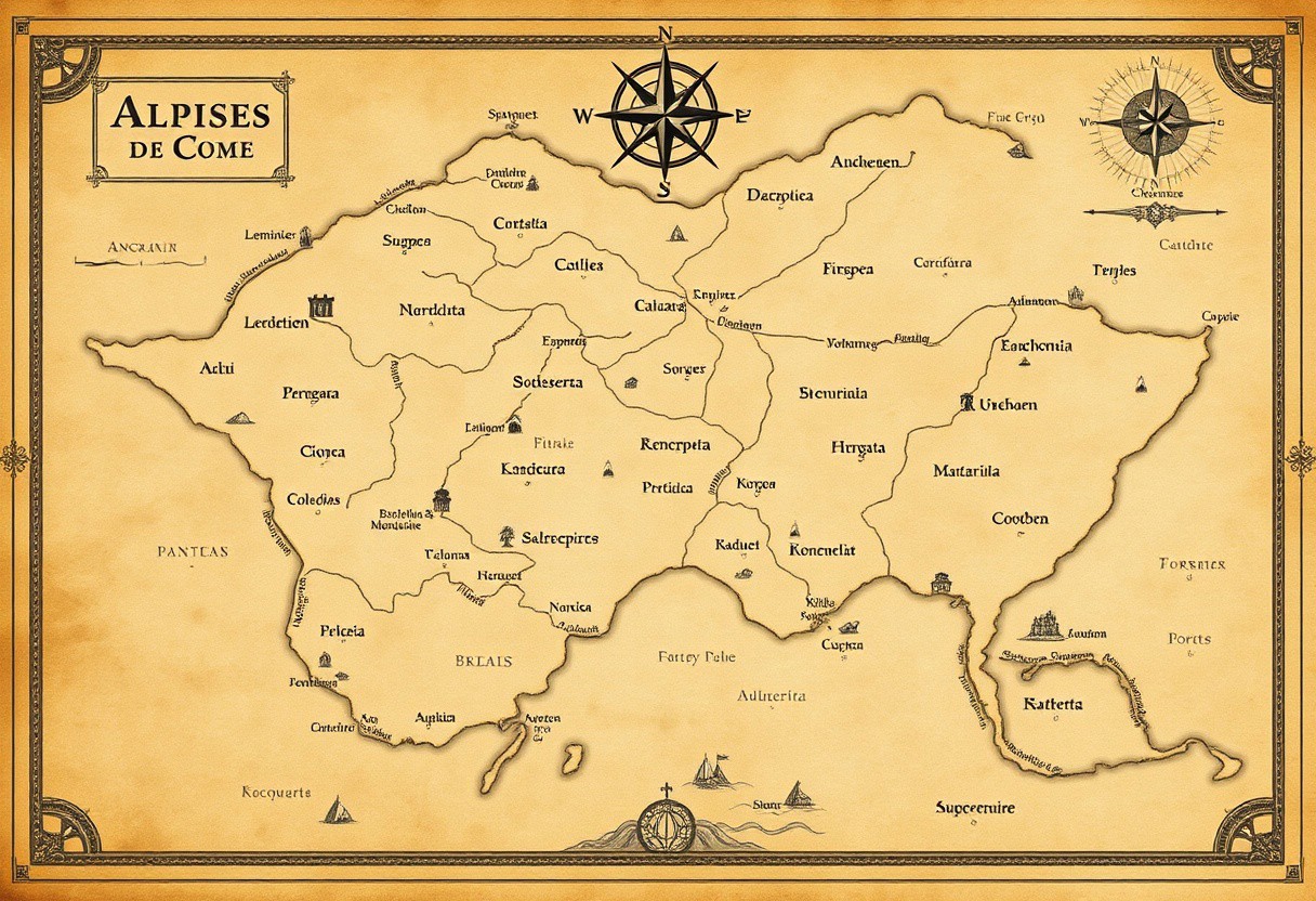 Elegant map of a vast fantasy world with an old, vintage feel. Minimalist design, aged parchment texture, delicate borders. Elegant calligraphy for labels, classic cartography style. Text in a latin inspired language. Smooth coastlines, rivers, hills, mountains and forests. Small towns, castles, and ports marked with basic icons. Intricate compass rose, subtle grid lines. Muted colors, sepia tones, and faded ink for an ancient, timeworn appearance. Map exudes an air of history and elegance, like an artifact from a forgotten era.