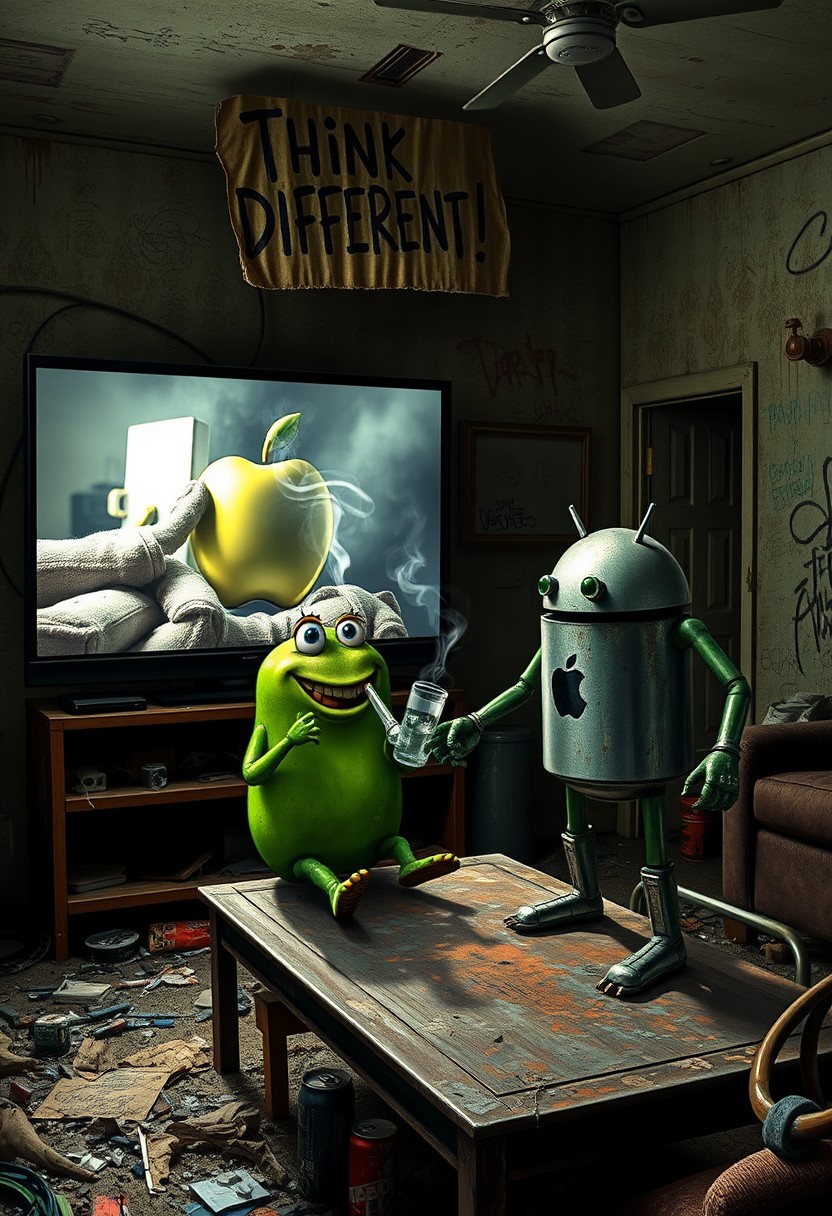 "In a grimy, dilapidated Florida crackhouse, a cartoonish green apple with exaggerated, glaring eyes and twisted limbs engages in a surreal confrontation with the iconic Android logo robot. The apple, seated on a battered, stained coffee table, grins menacingly, clutching a glass pipe. Wisps of smoke curl up from the pipe, drifting through the harsh, flickering light of a massive OLED TV mounted on the wall. The TV blares an unnervingly vivid Apple computer commercial, its bright visuals casting sharp, unsettling shadows across the room. The walls are covered in grime and graffiti, with peeling wallpaper and broken fixtures. The floor is littered with trash, broken furniture, and empty cans, adding to the squalid atmosphere. The Android robot, with a rusted, dented exterior and malfunctioning eyes, stands in a defensive stance with twitching antennae. Above the TV, a warped, grimy cardboard sign with 'Think Different!' hangs crookedly. The sign’s jagged, irregular lettering is illuminated by flickering LEDs, casting eerie shadows on the peeling stucco walls. The air is thick with the stench of mildew and decay, mixed with the acrid smell of smoke from the apple's pipe. The green apple’s glossy skin and the Android’s grimy, rusted body are highlighted by the cold, flickering light, enhancing the bizarre and unsettling scene in this derelict, drug-ridden setting."