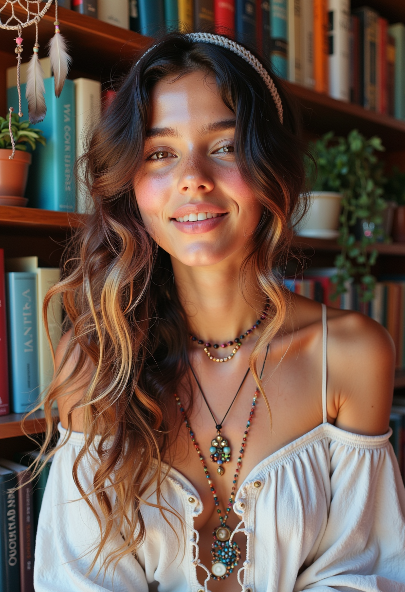 A webcam-style portrait of a 32-year-old woman with a bohemian flair, sitting in front of a bookshelf filled with colorful tomes and small potted plants. Her wavy, ombre hair flows from dark roots to sun-kissed ends, adorned with a thin braided headband. She wears a flowy, off-shoulder peasant blouse in earthy tones, accented by layered necklaces featuring natural stones and feathers. Her makeup is minimal and natural, emphasizing her warm brown eyes and sun-freckled cheeks. The soft, diffused lighting typical of a good-quality webcam highlights the textures of her outfit and the details of the eclectic background. A dreamcatcher hangs visible in one corner of the frame, adding to the free-spirited ambiance. Her expression is serene and inviting, with a gentle smile that crinkles the corners of her eyes, capturing the essence of a laid-back, creative spirit in this intimate webcam snapshot.