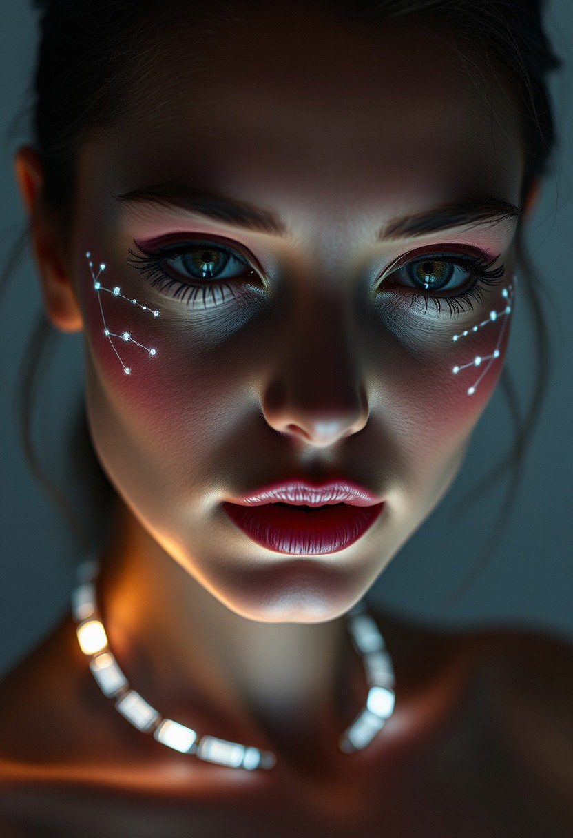 integrated LED body modification, permanent LED makeup, subtle glowing accents under the skin, (embedded LEDs:1.3) illuminating cheekbones and jawline, soft projected makeup, light patterns shifting with expressions, (flawless skin:1.4), futuristic yet natural, gentle LED glow defining facial features, seamless tech-enhanced beauty, (subtle under-skin glow), elegant LED accents on lips and eyes, ultra-modern body modification, high-definition, (good anatomy:1.4), radiant skin with integrated lighting, permanent light contours, soft and natural light projection, smooth textures blending LED with skin, facial definition enhanced by internal light, glowing accents integrated into facial structure, high-resolution, timeless beauty with advanced technology, LED glow replacing traditional makeup, precise lighting contours