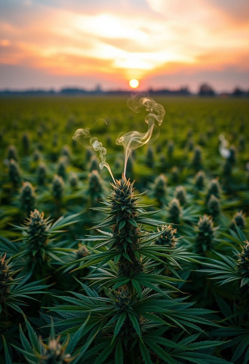 vibrant cannabis field, (lush green leaves:1.4), (sunset glow:1.2) casting warm light over the plants, (detailed textures:1.5), smoke swirling softly in the air, (cannabis buds:1.3) glistening with trichomes, peaceful and serene atmosphere, (natural light:1.4), wide field stretching into the distance, (colorful sky:1.2) with shades of pink and orange, (high-definition:1.6), (ultra-realistic textures:1.5), close-up details of cannabis plants, (soft focus in the background:1.2), modern, laid-back aesthetic, perfect for a cannabis culture feature, chill and relaxed vibe, (overexposed:-1.4), (unnatural colors:-1.5), (blurry:-1.6), (low-resolution:-1.7), (harsh lighting:-1.5), (distorted textures:-1.6)