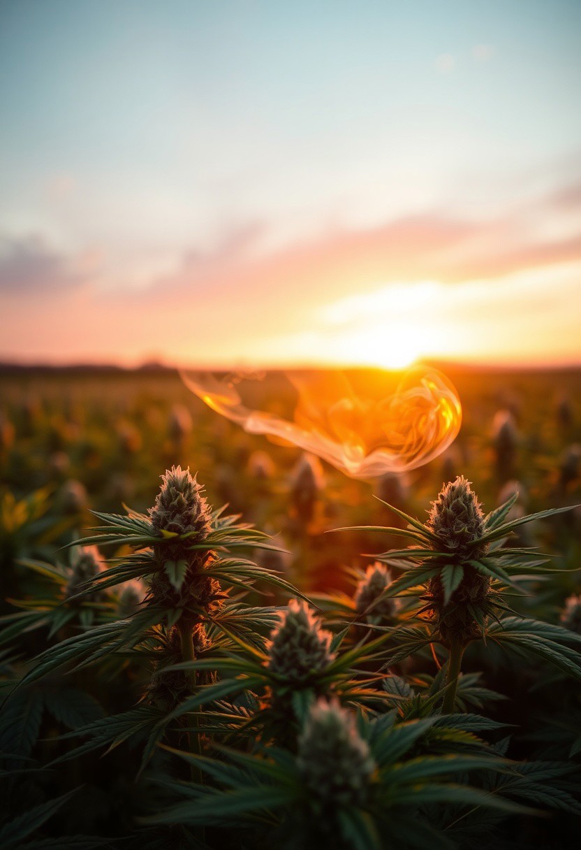 vibrant cannabis field, (lush green leaves:1.4), (sunset glow:1.2) casting warm light over the plants, (detailed textures:1.5), smoke swirling softly in the air, (cannabis buds:1.3) glistening with trichomes, peaceful and serene atmosphere, (natural light:1.4), wide field stretching into the distance, (colorful sky:1.2) with shades of pink and orange, (high-definition:1.6), (ultra-realistic textures:1.5), close-up details of cannabis plants, (soft focus in the background:1.2), modern, laid-back aesthetic, perfect for a cannabis culture feature, chill and relaxed vibe, (overexposed:-1.4), (unnatural colors:-1.5), (blurry:-1.6), (low-resolution:-1.7), (harsh lighting:-1.5), (distorted textures:-1.6)