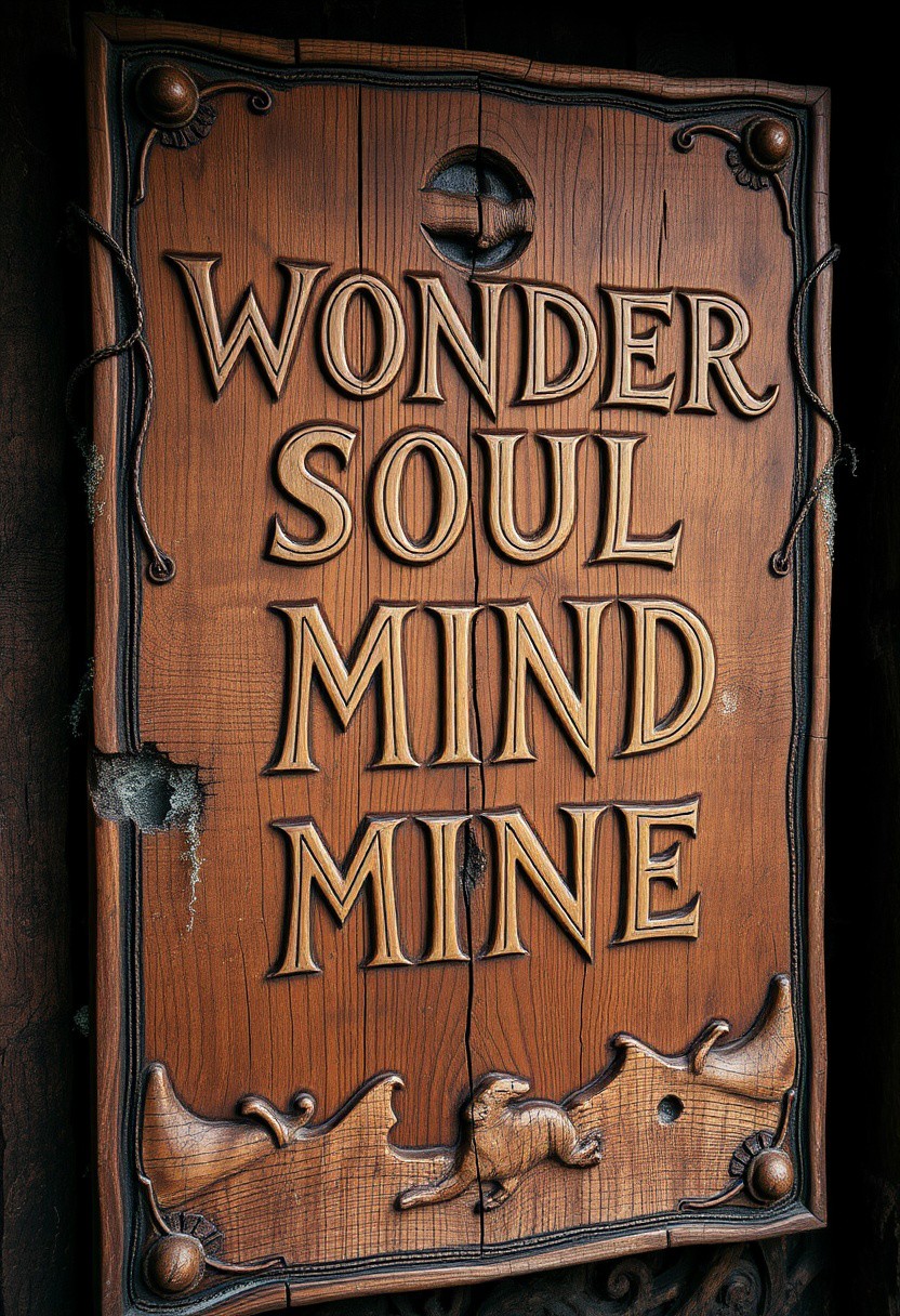 A large, rustic wooden sign with an ancient, weathered appearance, carved with intricate, ornate details, such as subtle engravings of swirling vines and mythical symbols along the edges. The wood texture is rich with deep grains, knots, and cracks, showing the effects of time and nature. Faint moss or lichen clings to the surface, adding to its old-world, mystical charm. The hand-written script is meticulously carved into the wood, flowing across four lines with the words: ‘WONDER,’ ‘SOUL,’ ‘MIND,’ and ‘MONEY.’ The wood appears slightly uneven, as though shaped by hand, with a natural, sublime beauty. Each letter seems to merge with the ancient carvings, as if it’s part of a centuries-old forgotten story.